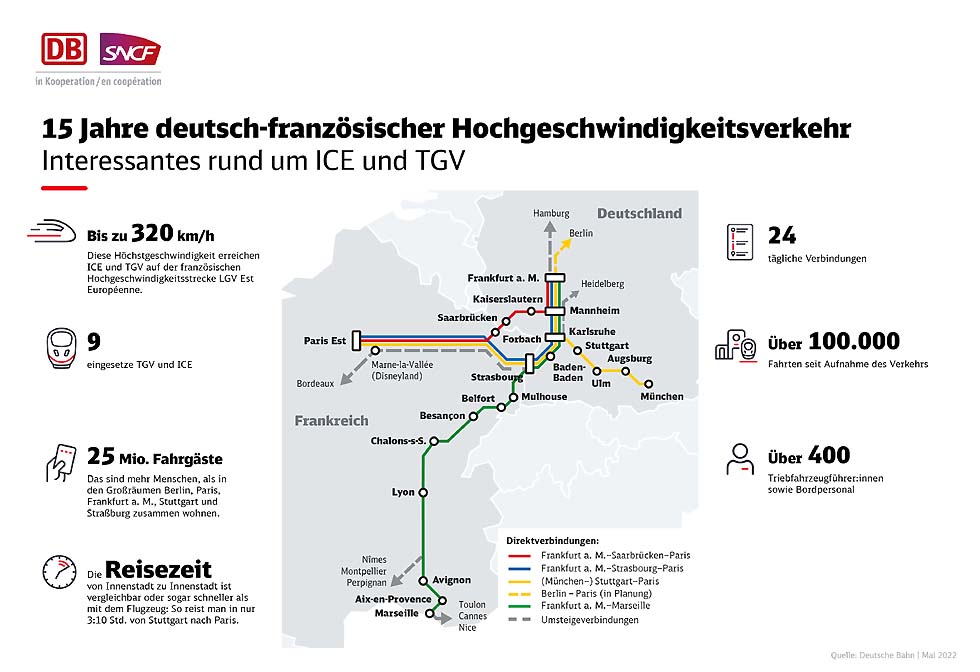 Die beiden großen europäischen Bahnen DB und SNCF blicken auf eine erfolgreiche Entwicklung ihrer 2007 gestarteten Kooperation im grenzüberschreitenden Hochgeschwindigkeitsverkehr zurück. Bei einem Festakt anlässlich des 15-jährigen Jubiläums in Straßburg würdigten Dr. Richard Lutz, Vorstandsvorsitzender der Deutschen Bahn, und Jean-Pierre Farandou, Präsident der SNCF, die Bilanz der erfolgreichen deutsch-französischen Zusammenarbeit. Rund 25 Millionen Menschen sind in diesem Zeitraum in die schnellen TGV und ICE eingestiegen, um in das jeweilige Nachbarland zu reisen. „Der Hochgeschwindigkeitsverkehr zwischen Deutschland und Frankreich ist ein herausragendes Beispiel dafür, wie attraktive Verbindungen die grenzüberschreitenden Verkehre auf der Schiene voranbringen. Ich glaube fest an das große Potenzial der Eisenbahn in und für Europa. Unsere geplante neue Direktverbindung zwischen den Herzen unserer beiden Hauptstädte wird noch mehr Menschen für die Zugfahrt begeistern“, sagte Richard Lutz. Jean-Pierre Farandou: „Unsere beiden Unternehmen arbeiten seit 15 Jahren in einer einmaligen Kooperation zusammen, in welcher wir unser Know-how bündeln, um das Beste aus dem deutschen und französischen Hochgeschwindigkeitsverkehr herauszuholen. Angesichts der Klimakrise ist die Schiene das Verkehrsmittel schlechthin und bietet die beste Alternative für Geschäfts- und Urlaubsreisen zwischen unseren beiden Ländern.“ Bundesverkehrsminister Dr. Volker Wissing: „Mit der Bahn umweltfreundlich durch Deutschland und Europa - dafür steht unser Konzept des TransEuropExpress 2.0. Mit Blick auf die großen Herausforderungen des Klimawandels muss die Bahn auch bei den innereuropäischen Verkehren eine stärkere Rolle spielen. Mit der neuen Hochgeschwindigkeitsverbindung Berlin-Paris kommt eine weitere attraktive Alternative zum Fliegen auf die Schiene. Die Kooperation zwischen DB und SNCF zeigt seit nunmehr 15 Jahren, wie es funktionieren kann.“ In einer Vereinbarung („Memorandum of Understanding“) verabredeten die Partner die Kooperation über 2025 hinaus fortzusetzen und die Verkehre auszuweiten. DB und SNCF arbeiten an einer Direktverbindung von Berlin nach Paris. Insgesamt bieten DB und SNCF derzeit täglich zwölf Direktverbindungen pro Richtung zwischen Frankreich und Deutschland an: Sechsmal geht es von Frankfurt/Main nach Paris. Von Stuttgart aus sind es fünf Verbindungen, wovon ein Zug von/nach München fährt. Schnellste Verbindung ist Stuttgart–Paris: Für die 600 Kilometer beträgt die Reisezeit 3:10 Stunden. Seit zehn Jahren verbindet ein Zug täglich direkt Frankfurt/Main und Marseille. Wachsende und attraktive Angebote führen in jüngster Zeit zu einem klaren Trend im Fernverkehr zwischen beiden Ländern: Zug statt Flug – das wählten 2021 über die Hälfte der Reisenden auf der Verbindung Frankfurt/Main–Paris und entschieden sich für die Bahnfahrt. Zwischen Stuttgart und Paris waren es sogar neun von zehn Reisenden. Freundlichkeit, Sprachkenntnisse und Kompetenz – das loben Fahrgäste bei Umfragen regelmäßig an den gemischten französisch-deutschen Teams an Bord. Den Geburtstag feiern DB und SNCF mit einem besonderen Angebot: Vom 25. Mai bis einschließlich 8. Juni gibt es bei beiden Bahnen insgesamt 15.000 Tickets für 29,90 Euro in der 2. Klasse (39,90 Euro in der 1. Klasse). Sie gelten für Fahrten auf der ICE- bzw. TGV-Strecke nach Frankreich sowie in die Gegenrichtung. Der Reisezeitraum ist zwischen dem 8. Juni und dem 30. September 2022.