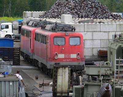 Bender, 16.08.10 Und wieder eine 140 weniger ...140 551 ++ 16.08.2010 Im Vordergrund werden noch die Radsätze und der Hauptransformator der 140 551 zerlegt - als nächste wäre dann 140 547 an der Reihe: Quelle:/Fotos: Markus Tigges, 16.08.2010 | |