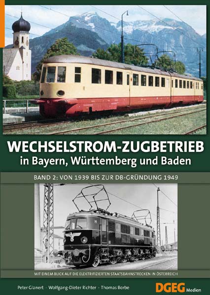 Zum dritten Mal wechselte das Autorenteam dieser Buchreihe den Verlag, nun erscheint das Buch bei DGEG Medien. Kernthema ist diesmal der Wechselstrom-Zugbetrieb in Bayern, Württemberg und Baden im Zeitraum 1939 bis 1949, wobei auch ein Blick auf die elektrifizierten Staatsbahnstrecken in Österreich geworfen wird. Das reich bebilderte Buch startet im letzten Friedenssommer 1939 und beleuchtet zunächst die dort aktuellen Neuanlieferungen und Projekte: Die Spannbreite reicht dabei von der E19 über die E94 und die Elektrifizierung der Strecke Nürnberg – Saalfeld bis hin zum Wendezug der E04 23 und dem geplanten Lokbeschaffungsprogramm, das dann so nie verwirklicht wurde. Ein Überblick über der damals vorhandenen Triebfahrzeugbestand (Ellok und ET) im Altreich und in der Ostmark (Österreich) rundet das Kapitel ab. Das zweite gut sechs Seiten lange Kapitel ist dem 50-Hz-Versuchsbetrieb im Höllental und dessen Ergebnisse gewidmet. Die Geschichte des Wechselstrom-Zugbetriebes im Zweiten Weltkrieg ist dann in zwei Kapitel unterteilt. Das erste beleuchtet den Zeitraum von 1940 bis 1942 und bietet u.a. einen Blick auf die Bahnstromversorgungen und die fahrbare Unterwerke, die Anpassungen der Fahrleitungen zwischen den Netzen sowie das 1940 vorgesehenen Elektrifizierungsprogramm der Reichsbahn. Auch Ellok-Neuentwicklungen wie die E18.2 oder Projekte wie die E46 oder die E100 finden Erwähnung. Abgerundet wird das Kapitel mit Ausführungen über die Bestandsentwicklung der Elloks und ET sowie einen Blick auf die Neubauelloks der Reihe E94. Die Jahre 1943 bis 1945 bieten dann weitere Infos über die Bestandsentwicklungen, einen Blick auf die Betriebsabteilung München I und das Bw München. Dabei wird natürlich auch auf die zahlreichen Kriegsschäden bei den einzelnen Baureihen eingegangen.