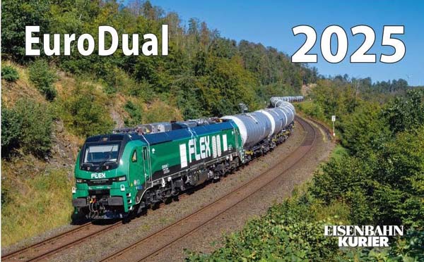 Eurodual 2025 Die modernen Zweikraftloks des Typs EuroDual von Stadler sind wahre Kraftpakte. Sowohl im Elektro- als auch im Dieselmodus sind die sechsachsigen Maschinen das ideale Zugpferd für schwere Güterzüge. Immer mehr Bahnunternehmen setzen daher auf die in Spanien gebauten Lokomotiven. 13 farbige Kalenderblätter auf Kunstdruckpapier mit Spiralbindung