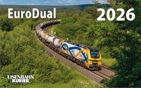 EuroDual 2026 Die modernen Zweikraftloks des Typs EuroDual von Stadler sind wahre Kraftpakte. Sowohl im Elektro- als auch im Dieselmodus sind die sechsachsigen Maschinen das ideale Zugpferd für schwere Güterzüge. Immer mehr Bahnunternehmen setzen daher auf die in Spanien gebauten Lokomotiven. 13 farbige Kalenderblätter auf Kunstdruckpapier,