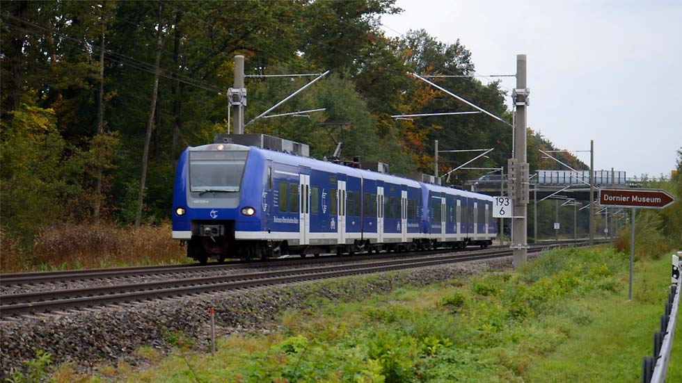 ![]() Bodensee-Oberschwaben-Bahn 426 039 & 041 als RB 91 nach Aulendorf passiert gleich die Bushaltestelle am Dornier Museum am Bodensee-Airport in Friedrichshafen, 08.10.2022. (Michael Ruge) |