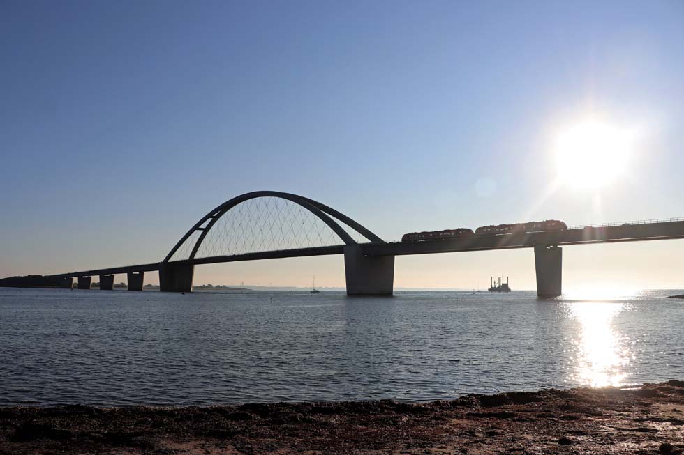 ![]() Im Gegenlicht - Vogelfluglinie - Fehmarnsundbrücke mit RB der DB Regio, 2021 (Deutsche Bahn AG / Steve Wiktor) |