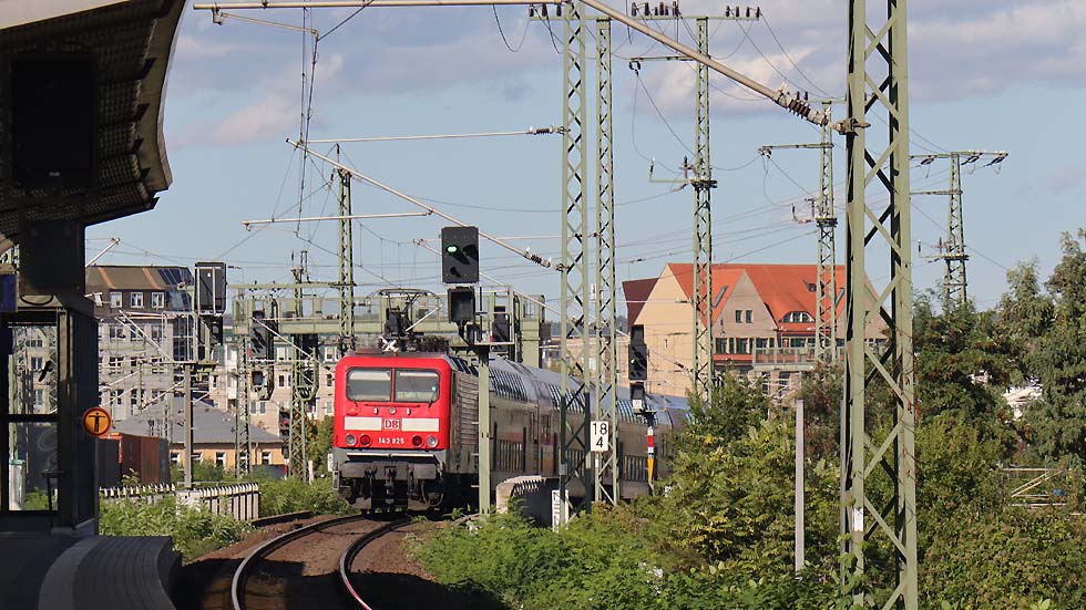 ![]() Die 143 925 von DB Regio Südost mit der S1 (31738) nach Meißen-Altstadt verläßt den Hp Dresden-Freiberger Straße. (Stefan Gruner) |