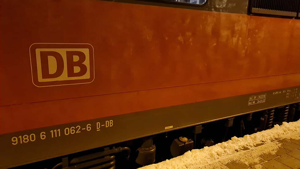 09.01.2023 Daten 111 062.. 111 062-6 erhielt am 16.03.2016 im Werk Freiburg (Breisgau) Hbf ihre Untersuchung. Zuletzt war diese Lok im Bahnbetriebswerk Dortmund beheimatet bevor sie am 28.12.2021 nach München kam. In Ihrem neuen Bahnbetriebswerk München wurde an ihr eine IS 930 ausgeführt und ihre Fristen verlängert. Nun kann die Lok bis zum 24.02.202... |