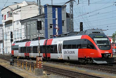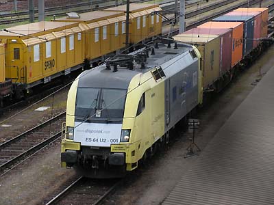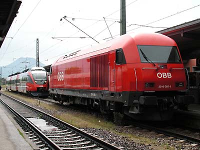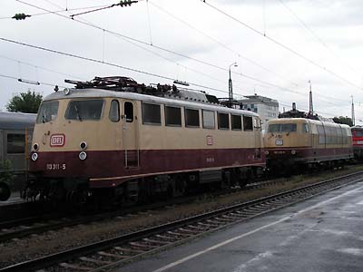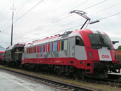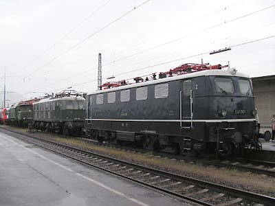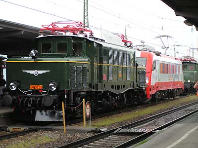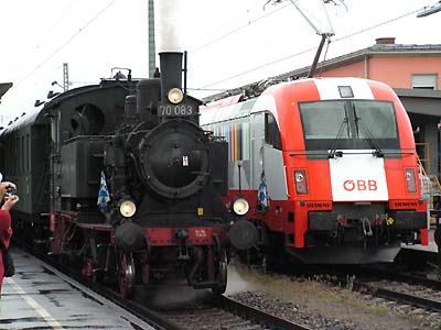 Schon das 3. Mal gab die Bahn einen Anlass, sich publikumswirksam in Szene zu setzen. Nach der Taufe eines ICE und der Überführung der Museums-Loks aus dem Deutschen Museum zur neuen Außenstelle, wurde am 17. Juni 2006 die erste grenzüberschreitende S-Bahnstrecke in Freilassing offiziell gefeiert. Nach diversen Ansprachen der deutschen und österreichischen Bahn-Verantwortlichen, sowie des Bürgermeisters von Freilassing wurde ein elektrischer Triebzug "Talent" 4023 003 der Salzburger S-Bahn auf den Namen "Stadt Freilassing" getauft. Nicht nur Weihwasser erreichte den Zug, sondern auch viel Wasser aus "Petrus Weihwasser-Wolke". Nach der Taufe fuhr der Talent "Stadt Freilassing" mit den Festgästen Richtung Berchtesgaden und das Bahnhoffest war offiziell freigegeben. Anlässlich dieser Eröffnung wurden einige historische, aber auch moderne Loks der DB und ÖBB aufgeboten. U.A. waren zu sehen: der 1. "Olympia S-Bahn-Zug" aus München ET 420 001 (der IGS-München), je ein österreichisches 1020.47 und deutsches 194 158 "Krokodil". Außerdem waren zu sehen, die österreichische BR 1216 226 mit den EU Fahnen und die Diesellok BR 2016 085 (Herkules). Die DB präsentierte einen Querschnitt der deutschen Eisenbahngeschichte: die Dampflok BR 70 083 und BR 169 005 (Bayrischer Localbahn Verein) die mit einem Sonderzug nach Bad Reichenhall pendelten und sich mit dem ET 420 001 ablöste. Mit E18 08 (Augsburger Bahnpark), sowie der 103 235 (Systemtechnik München) und den Einheitsloks E41 001, 110 348, 113 311 und der BR E40 128 mit der Fahrerstandmitfahrten gemacht werden konnten, (zur Verfügung gestellt vom Eisenbahn-Museum Koblenz), sowie einer Diesellok 218 341 (beheimatet in Regensburg) war der Fuhrpark ausreichend abgerundet. 70 083 169 005 E 41 001 und E 18 08 E 40 128 110 348 113 311 194 158 1020.47 1216.226 2016.085 420 001 4023 003 "Stadt Freilassing"Bei einem Abstecher nach Salzburg konnten wir zudem sichten: Die E-Loks 1142 694 mit einem City-Shuttle, ES64 U2-001 (Lokomotion), 1116 015 mit einem EC nach Graz, ET 6010 004 und 4023 004 und die Rangierlok 1163 006. 6010 004 1142 694 ES 64 U2 001 4023 004Text und Bilder: Heiner und Sascha Prochazka |