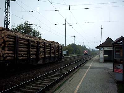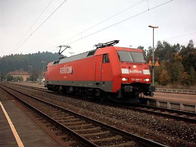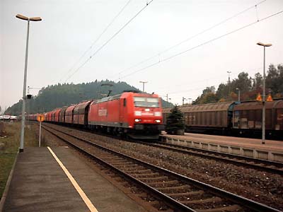 Noch ein Bild der 151 017 in Pressig-RothenkirchenDa erst gg. 10.10 Uhr der nächste Güterzug nachgeschoben werden sollte, begaben wir uns an den Scheitelpunkt der Strecke nach Steinbach am Wald in ca. 585 m über Meereshöhe. Diesen durcheilt aber erst der ICE 1713 Berlin-München.