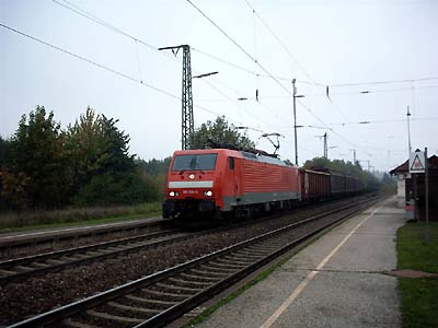 Eine 185 fährt in flotter Fahrt mit Ihrem Güterzug Richtung Steinbach am Wald durch den Bahnhof Pressig-Rothenkirchen. Sie benötigt für diese Last keine Schubunterstützung.