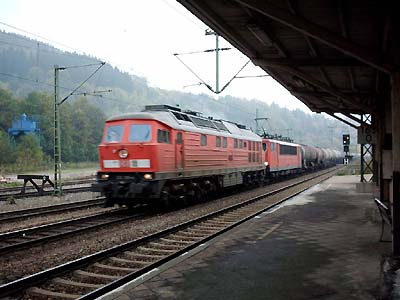 232 395 als Vorspann und 155 200 rollen mit einem Kesselwagenzug in den Bahnhof Probstzella ein. An dessen Schluss setzt sich 151 017 noch als Schublok. (Bild 31)