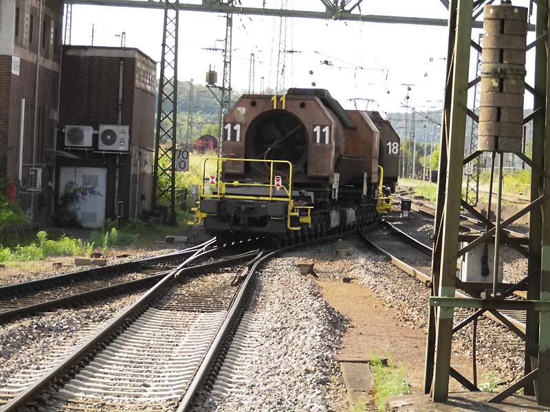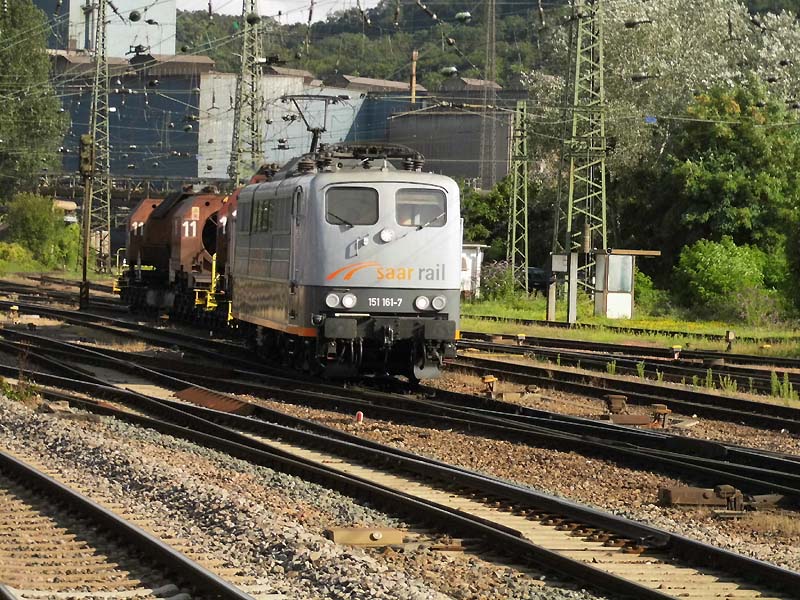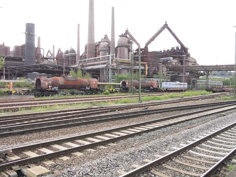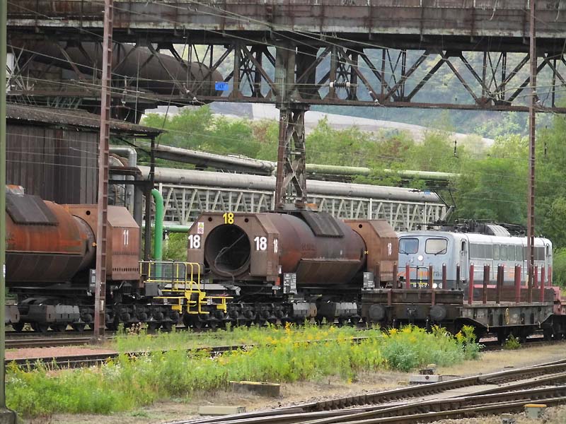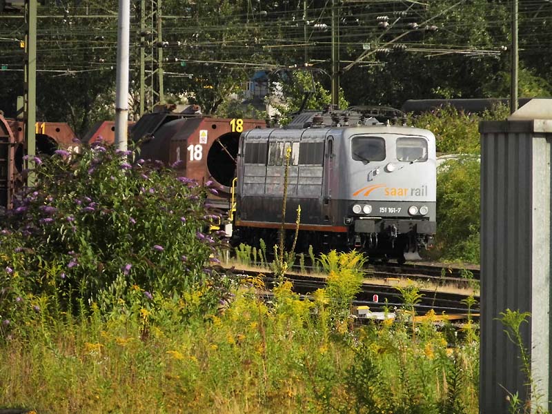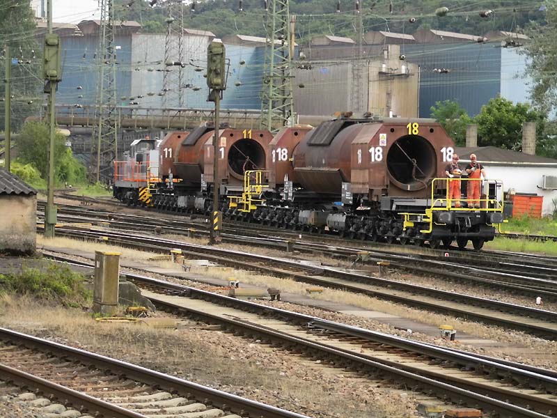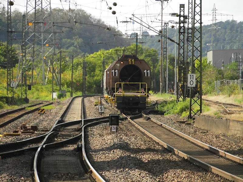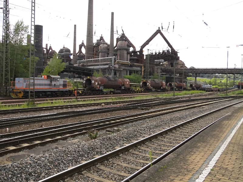 Man muss von meiner Haustür nur etwa 600 km fahren, um mit gewisser Sicherheit eine 151 zu sehen. Das habe ich getan und bin im Rahmen eines Kurzurlaubs in Völklingen auf Stippvisite gelandet. Am 19. August nachmittags um halb Fünf habe ich mich auf dem Bahnsteig an der nördlichen Bahnhofsseite postiert, in Erwartung des Suppenzuges, der kurz vor Fünf planmäßig aus Dillingen anrollen sollte. Hier die Ereignisse im Einzelnen: ![]() Zunächst musste ich die BB37015 ablichten, die mit einem Leerzug saarabwärts unterwegs war. ![]() Aus Richtung Dillingen kam dann 145 001 mit einem Zug voller Bleche durchgefahren. Die Übergrößen werden schräg liegend transportiert, ein ungewohnter Anblick. ![]() ![]() Den RE1 von Mannheim nach Koblenz bewerkstelligt 429 617. ![]() Etwa eine Viertelstunde vor Plan ist es dann soweit, die Suppe kommt! 151 161 der Saarrail kommt mit zwei 'Suppenschüsseln' voll Roheisen aus Dillingen und zieht vor dem Welterbe Völklinger Hütte in den Bahnhof. ![]() ![]() Als nächstes drückt die 151 die Torpedowagen in das Übergabegleis vor der Völklinger Hütte, wo sie abgestellt werden. ![]() ![]() Nach dem Abhängen umfährt 151 161 ihre Fracht und bezieht Position im Nachbargleis. ![]() ![]() Die Henschellok Saarrail 72 bringt kurze Zeit später das 'Leergut' zum Tausch - zwei leere Torpedowagen werden in das Gleis zu 151 161 geschoben. ![]() ![]() 151 161 setzt an die Wagen heran und wird gekuppelt, während die Henschellok an die vollen Torpedowagen wechselt. ![]() ![]() Beide Züge auf einem Bild vor dem Welterbe - aber nur kurz, denn Lok 72 zieht das Roheisen sogleich in das Saarstahlwerk. ![]() ![]() Nach erfolgter Bremsprobe drückt 151 161 die beiden leeren Wagen in den Bahnhof zurück, wo sie in fast Gartenumgebung darauf wartet, dass die RE1 den Bahnhof passieren und dann die Rückfahrt nach Dillingen angetreten werden kann. ![]() ![]() ![]() Zunächst kommt der RE1 nach Koblenz in Form von 429 626, dann der Gegenzug nach Mannheim mit 429 600 - was der Sprayer mit '110 mal' meinte, erschließt sich mir nicht. ![]() ![]() Dann kann es losgehen, und es geht schnell: 151 161 beschleunigt ihr Leergut rasch und fädelt sich in die Strecke nach Dillingen ein. ![]() ![]() ![]() Text und Bilder: Thomas Förster |