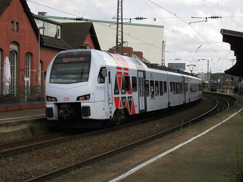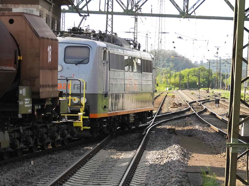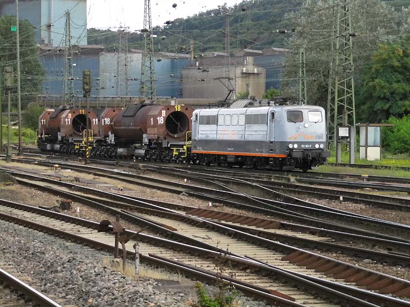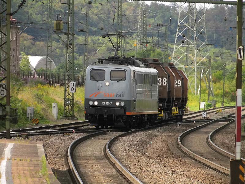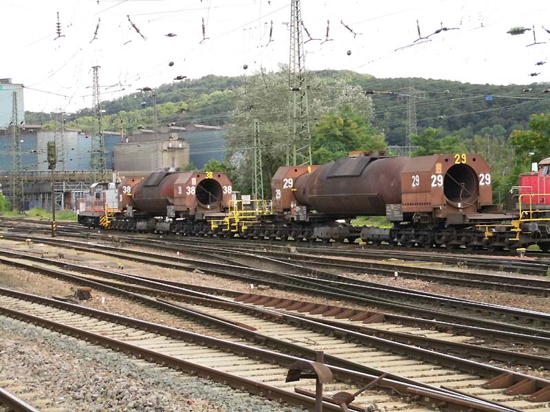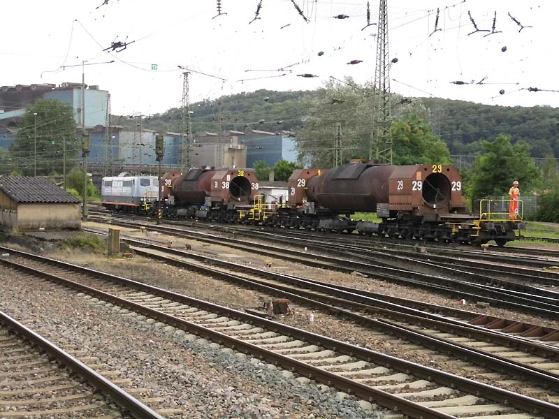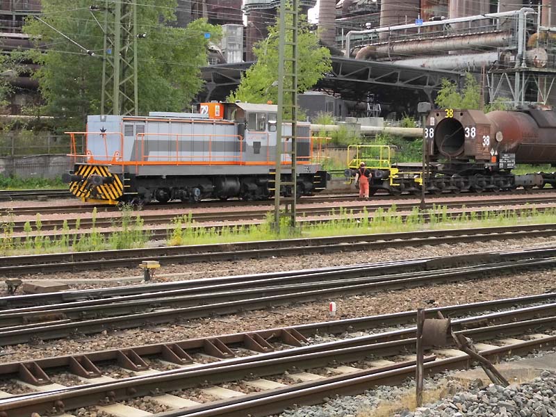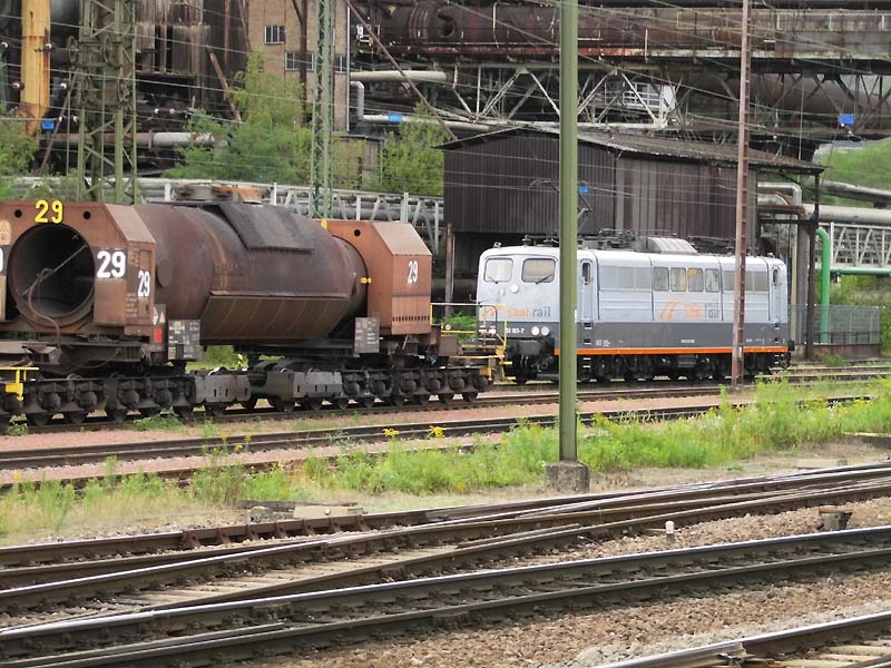 Man muss von meiner Haustür nur etwa 600 km fahren, um mit gewisser Sicherheit eine 151 zu sehen. Das habe ich getan und bin im Rahmen eines Kurzurlaubs in Völklingen auf Stippvisite gelandet. Am 19. August nachmittags um halb Fünf habe ich mich auf dem Bahnsteig an der nördlichen Bahnhofsseite postiert, in Erwartung des Suppenzuges, der kurz vor Fünf planmäßig aus Dillingen anrollen sollte. Hier die Ereignisse im Einzelnen: ![]() Zunächst musste ich die BB37015 ablichten, die mit einem Leerzug saarabwärts unterwegs war. ![]() Aus Richtung Dillingen kam dann 145 001 mit einem Zug voller Bleche durchgefahren. Die Übergrößen werden schräg liegend transportiert, ein ungewohnter Anblick. ![]() ![]() Den RE1 von Mannheim nach Koblenz bewerkstelligt 429 617. ![]() Etwa eine Viertelstunde vor Plan ist es dann soweit, die Suppe kommt! 151 161 der Saarrail kommt mit zwei 'Suppenschüsseln' voll Roheisen aus Dillingen und zieht vor dem Welterbe Völklinger Hütte in den Bahnhof. ![]() ![]() Als nächstes drückt die 151 die Torpedowagen in das Übergabegleis vor der Völklinger Hütte, wo sie abgestellt werden. ![]() ![]() Nach dem Abhängen umfährt 151 161 ihre Fracht und bezieht Position im Nachbargleis. ![]() ![]() Die Henschellok Saarrail 72 bringt kurze Zeit später das 'Leergut' zum Tausch - zwei leere Torpedowagen werden in das Gleis zu 151 161 geschoben. ![]() ![]() 151 161 setzt an die Wagen heran und wird gekuppelt, während die Henschellok an die vollen Torpedowagen wechselt. ![]() ![]() Beide Züge auf einem Bild vor dem Welterbe - aber nur kurz, denn Lok 72 zieht das Roheisen sogleich in das Saarstahlwerk. ![]() ![]() Nach erfolgter Bremsprobe drückt 151 161 die beiden leeren Wagen in den Bahnhof zurück, wo sie in fast Gartenumgebung darauf wartet, dass die RE1 den Bahnhof passieren und dann die Rückfahrt nach Dillingen angetreten werden kann. ![]() ![]() ![]() Zunächst kommt der RE1 nach Koblenz in Form von 429 626, dann der Gegenzug nach Mannheim mit 429 600 - was der Sprayer mit '110 mal' meinte, erschließt sich mir nicht. ![]() ![]() Dann kann es losgehen, und es geht schnell: 151 161 beschleunigt ihr Leergut rasch und fädelt sich in die Strecke nach Dillingen ein. ![]() ![]() ![]() Text und Bilder: Thomas Förster |