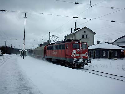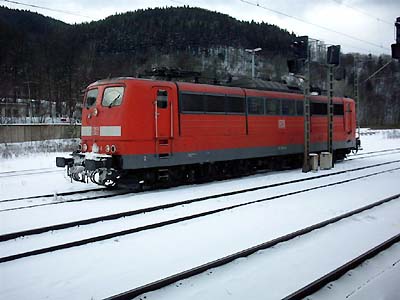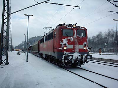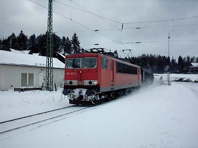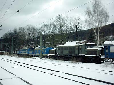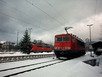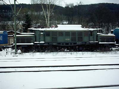 In Probstzella angekommen (die 1020.041 als "neue" Schiebelok der Privaten und seltener Gast - unser eigentliches Ziel unserer Fahrt!) sahen wir die beiden E 94 stehen. Die 1020 voll einsatzbereit aufgerüstet und die E94 580 eingeschneit. Wie wir später noch erfuhren, wurde die E 94 am Schaltwerk schadhaft. Danach versuchte man Sie zu reparieren, was aber im Nachhinein mißlang. Damit schädigte man nämlich auch noch den Trafo und riß zum guten Schluss noch ein Stück Fahrleitung herunter. Ob man in absehbarer Zeit die E 94 580 wieder aufarbeitet und wieder in Fahrt bringt? Ein paar Impressionen der beiden "Altbau-Elloks":