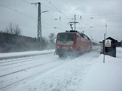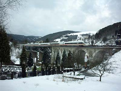 Hier nur das Bild des ICE 1609 von Hamburg nach Nürnberg auf dem Viadukt. Wenige Minuten vorher kam der Gegenzug ICE 1608 mit zwei 411-Garnituren vorbei. Da es immer wieder geschneit hat; durch den Ostwind die Temperatur sich noch kälter anfühlte und sich partout kein Güterzug blicken ließ, räumten wir das Feld :-((