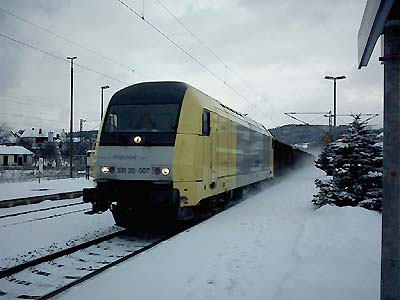Von Probstzella fuhr dann doch noch ein "Privater" über den Berg. Es war dies die ER 20 007 mit einem Schrottleerzug. Leider benötigte sie nicht die Unterstützung der 1020.041, die in diesem Fall gekuppelt bis Pressig am Zug geblieben wäre.
