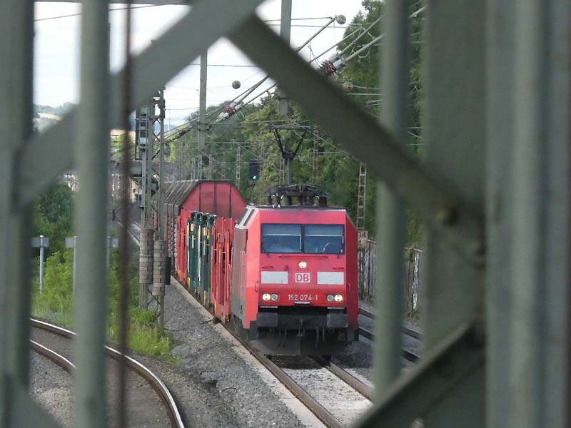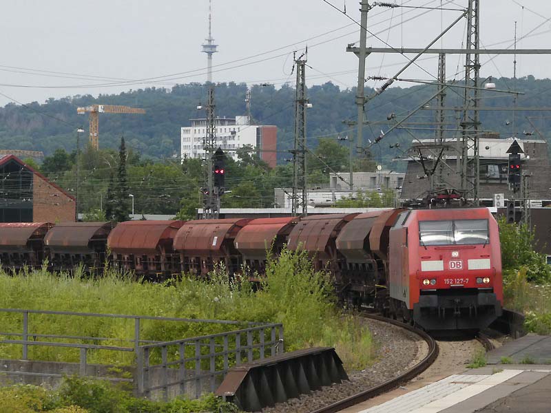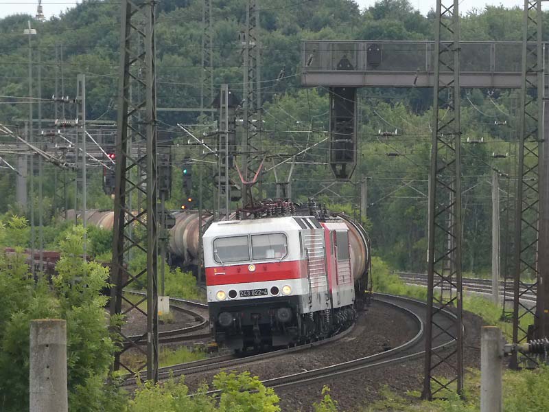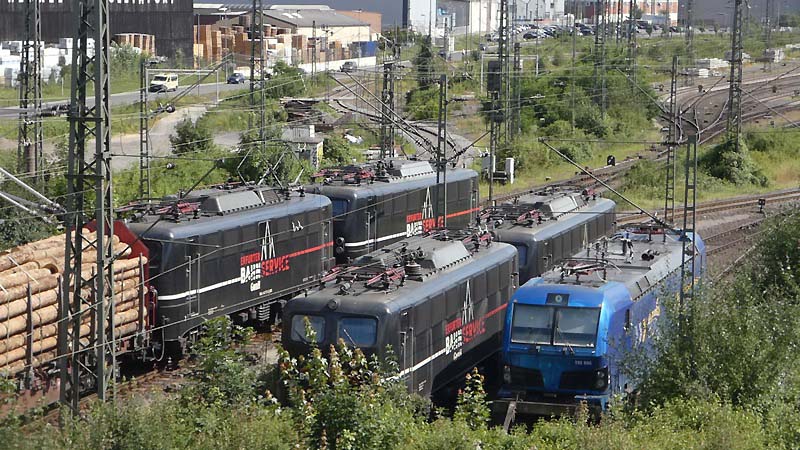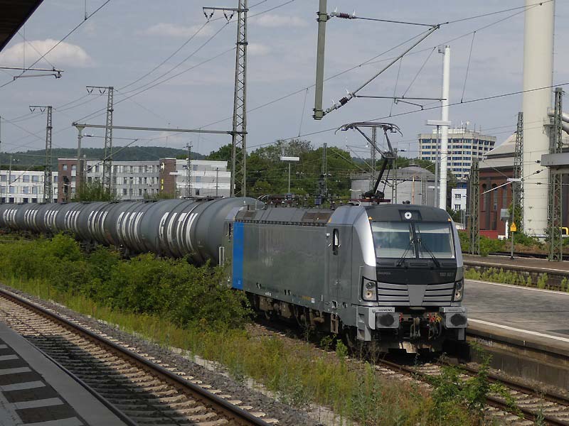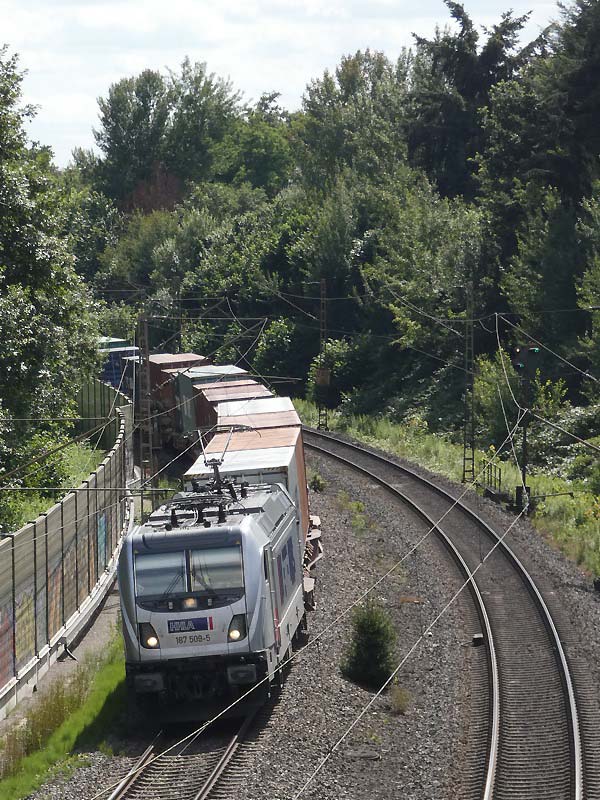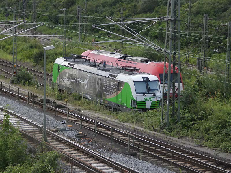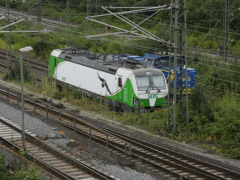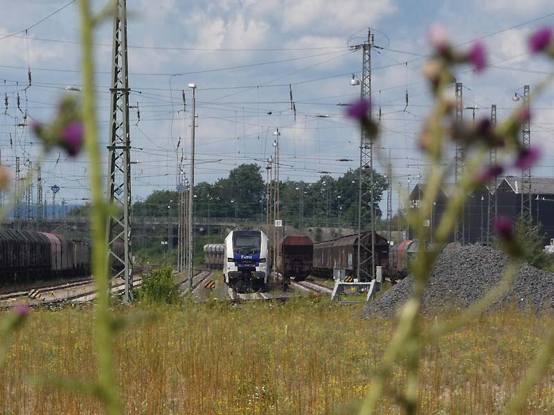 Anbei ein Ausflug an verschiedene Bildstandorte der Nord-Süd-Strecke und der Schnellfahrstrecke Hannover - Würzburg, im Raum Göttingen von Nord nach Süd. Die km der Nord-Süd-Strecke beginnen im Stadtgebiet Göttingen bei km 104,8 in Göttingen Weende und enden im Bf am Prellbock von Gleis 3 mit km 108,0. Ab dort wird bis Frankfurt/Main rückwärts gezählt. Die Strecke von Ffm endet in Göttingen bei km 247,2. Die daneben verlaufende Schnellfahrstrecke Hannover - Würzburg liegt in Göttingen Weende bei km 96,2 und zieht sich bis km 102-4 neben der Siekhöhe. Göttingen Weende Friedrich-Ebert-Strasse km 104,8 der Nord-Süd-Strecke. Es kann in beiden Richtungen fotografiert werden. Nach Norden gibt es eine Gerade in Richtung Bovenden und den Abzweig nach Paderborn. Nach Süden liegt der nördl. Bereich des Gbf in einer Kurve. Entlang der Strasse lassen sich Aufnahmen aus unterschiedlicher Höhe machen. ![]() 193 841-4 Boxxpress Göttingen Weende, 12.07.2020 ![]() 146 532-7 Metronom. Göttingen, 12.07.2020 ![]() 193 266 TXL mit Kesselzug, 12.07.2020 ![]() 146 515 Metronom am Abzweig nach Paderborn, Göttingen, 11.07.2020 ![]() 185 666-5 Lokomotion mit Klv-Zug, Göttingen, 12.07.2020 ![]() 152 037-8 und 2. 152 mit Ganzzug Schüttgutwaggons. Im Gbf wird die vordere Lok umlaufen und dann gekuppelt den Schub übernehmen. Dieser Zug kommt Sonntags zwischen 16 - 17 in Göttingen an. Göttingen, 12.07.2020 ![]() 193 960 WLC begegnet Autozug in Göttingen Weende, Göttingen, 12.07.2020 ![]() 152 074-1 mit kurzem Autozug, Göttingen, 12.07.2020 ![]() 185 146-8 vor Kesselzug, Göttingen 14.07.2020 ![]() 193 759 mit Holzzug begegnet Kesselzug, Göttingen, 14.07.2020 ![]() 187 304-1 Railpool in der Nordkurve am Gbf, Göttingen, 14.07.2020 ![]() 187 009-6 SETG LZ in Richtung Norden, Göttingen, 14.07.2020 ![]() 193 642 MRCE mit freundlichem Gesicht, Göttingen, 14.07.2020 ![]() 212 347-9 mit Schwesterlok, Göttingen, 14.07.2020 ![]() 243 822-4 und 155 119 mit Kalilaugenzug in der Nordkurve des Gbf, Göttingen, 17.07.2020 ![]() 243 822-4 mit 155 119 mit leeren Waggons auf der Rückfahrt, Göttingen, 18.07.2020 ![]() 192 014 RTB Cargo mit ARS-Altmann Zug, Göttingen, 18.07.2020 ![]() 181 204-9 SEL - Rügen - mit Diesellok ESG 8 - Schwabensprinter - vor schwerem Bauzug, Göttingen, 17.07.2020 ![]() 181 204-9 SEL - Rügen - mit Diesellok ESG 8 - Schwabensprinter - vor schwerem Bauzug, Göttingen, 17.07.2020 Göttingen Weende Friedrich-Ebert-Strasse Schnellfahrstrecke Hannover - Würzburg km 96,2 An dieser Stelle kommt man nur schlecht an die Namen oder Nummern der ICE. Bei den Lokbespannten IC's ist es einfacher. Zwischen 16:09 - 16:35 fahren 3 Züge mit Loks durch. 16:09 ICE 1196 nach Berlin 16:18 IC 2082 nach Hamburg 16:35 IC 2375 nach Karlsruhe Freitags und Sonntags gibt noch einige IC's extra. ![]() ICE-T 411 xxx in Göttingen Weende, Göttingen, 25.07.2020 ![]() 401 xxx Göttingen Weende, 25.07.2020 ![]() 101 126-1 mit ICE 1196 nach Berlin, Göttingen, 25.07.2020 ![]() 101 027-1 mit IC 2082 nach Hamburg, Göttingen, 25.07.2020 ![]() 101 050 mit IC 2375 nach Karlsruhe, Göttingen, 25.07.2020 ![]() Doppelter 411 xxx in Richtung Norden, Göttingen, 27.07.2020 ![]() 101 068-5 um 13:29 in Richtung Norden, Göttingen, 27.07.2020 ![]() 411 xxx auf dem Weg zum Bf Göttingen, 27.07.2020 Göttingen Gbf Brücke Rinschenrott km 106,0 der Nord-Süd-Strecke und km 97,4 der Schnellfahrstrecke. Die Brücke wird als Rad- und Fußgängerbrücke genutzt, keine Autos. Erreichbar vom Baumarkt Globus aus. ![]() 152 079-0 mit Ganzzug, Göttingen, 07.07.2020 ![]() Versammlung am Ablaufberg von 4 Loks der Br 140 EBS 140 772, 789, 811 und 815. 192 005 EVB in der Abtellung. Göttingen, 07.07.2020 ![]() 482 020-5 sbb Cargo, Göttingen, 07.07.2020 ![]() 193 204 SETG Mozart in der Abstellung, Göttingen, 11.07.2020 ![]() Gbf um 18:30 mit Blick auf die Stadt. Die weissen Gebäude am Ende des Gbf markieren den nächsten Fotostandort hinter dem Restaurant Amavi. Göttingen, 12.07.2020 ![]() 401 xxx auf dem Weg zum Bf hinter der nächsten Kurve. Göttingen, 13.07.2020 ![]() 401 xxx hat soeben den Bf in Richtung Norden verlassen, Göttingen, 13.07.2020 ![]() ICE-4 9203 auf Testfahrt in Richtung Bf Göttingen, 13.07.2020 ![]() 101 032-1 mit IC 2082. Göttingen, 13.07.2020 ![]() ICE-4 412 xxx in Richtung Norden. Göttingen, 13.07.2020 ![]() 185 052-8 vor Containerzug am Gbf Göttingen, 13.07.2020 ![]() ICE-4 412 xxx kurz vor dem Bf Göttingen, 14.07.2020 ![]() 193 550 TXL mit KLV-Zug. Göttingen, 23.07.2020 ![]() 193 814 SETG - Der Bartgeier - in der Abstellung. Göttingen, 27.07.2020 Gbf km 107,4 und SFS km 98,8 hinter dem Restaurant Amavi und Goethe-Institut. 3 weisse Bürogebäude. ![]() 151 025-4 Göttingen, 02.07.2020 ![]() 193 726 ELL RTBcargo mit ARS-Altmann-Zug. Göttingen, 02.07.2020 ![]() 185 107-0 mit Ganzzug Schiebewandwagen für VW. Göttingen, 03.07.2020 ![]() 193 284 B&S Logistik mit Containerzug südwärts. Göttingen, 03.07.2020 ![]() 185 205-2 -Das ist grün-. Göttingen, 03.07.2020 ![]() 159 204 HHPI ist Lz in Richtung Süden unterwegs. Göttingen, 06.07.2020 ![]() 402 020-2 ist wiederholt Solo unterwegs. Göttingen, 07.07.2020 ![]() 185 539-4 TXL. Göttingen, 09.07.2020 ![]() 143 124-6 FWK mit 2. 143 vor Kalilaugenzug. Göttingen, 09.07.2020 ![]() 193 764 ELL Lz südwärts. Göttingen, 09.07.2020 ![]() 159 202 HHPI wartet im Gbf auf neue Arbeit. Göttingen, 12.07.2020 ![]() 111 210 Railadventure in Richtung Norden, Göttingen, 13.07.2020 ![]() 186 383 HSL mit Ganzzug Schüttgutwaggons. Göttingen, 14.07.2020 ![]() 185 595-6 Freightliner DE. Göttingen, 14.07.2020 ![]() 243 822-4 und 155 119 FWK mit Kalilaugenzug. Göttingen, 15.07.2020 ![]() 218 402-6 RP - Pidder Lüng - auf der SFS nordwärts. Göttingen, 15.07.2020 ![]() 101 030-5 BKK Göttingen, 18.07.2020 ![]() 185 409-0 Raildox mit STRABAG Bauzug. Göttingen, 21.07.2020 Brücke über der Godehardstrasse km 99,2 SFS. Die Brücke erreicht man, indem man im Bf 