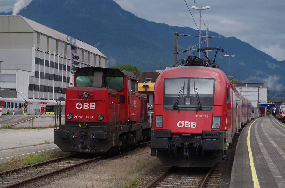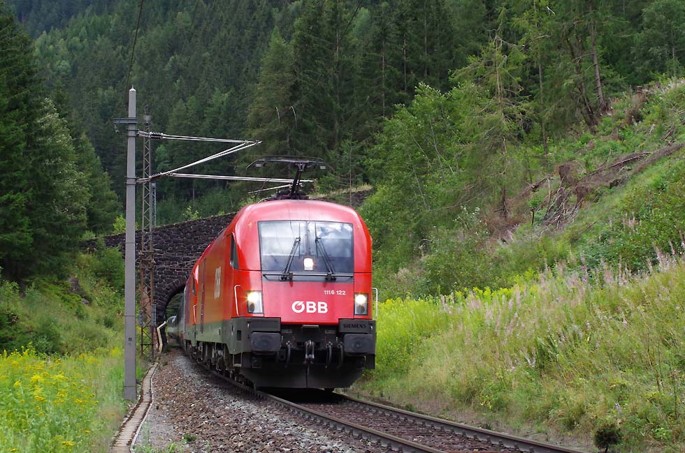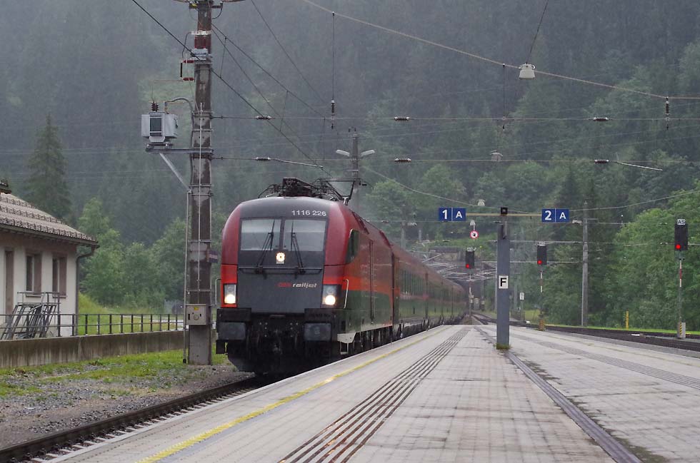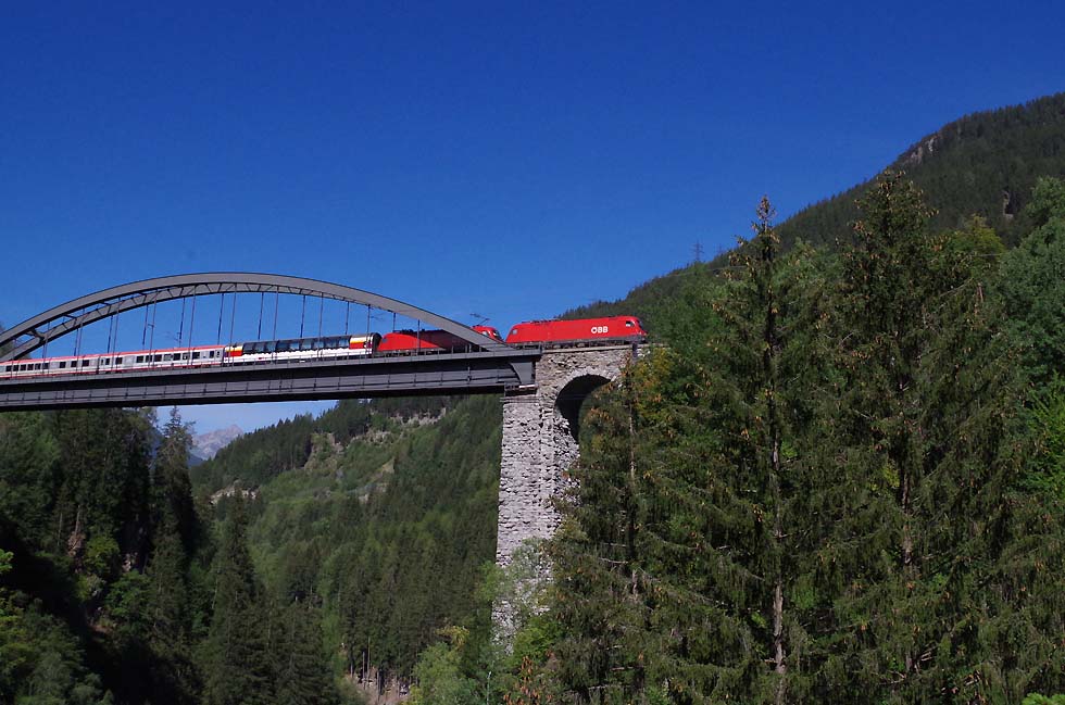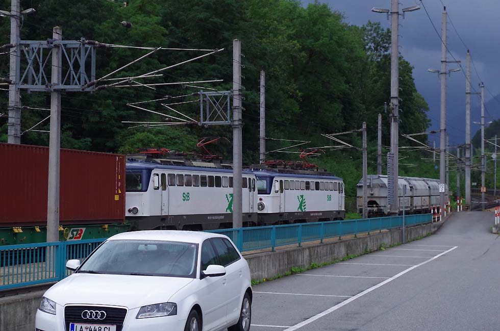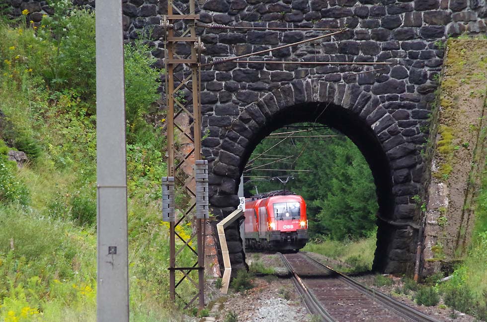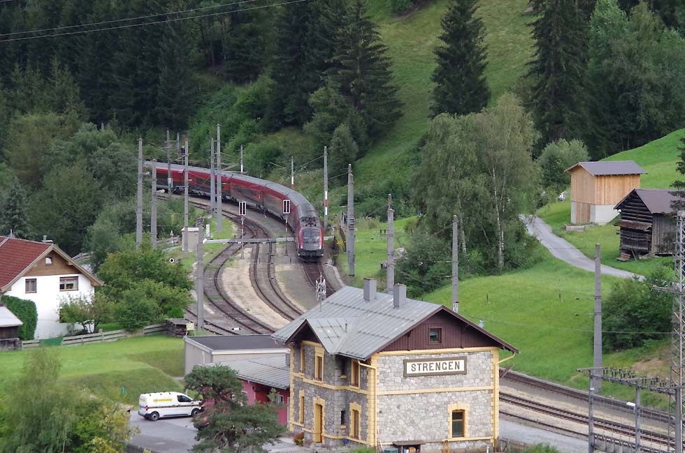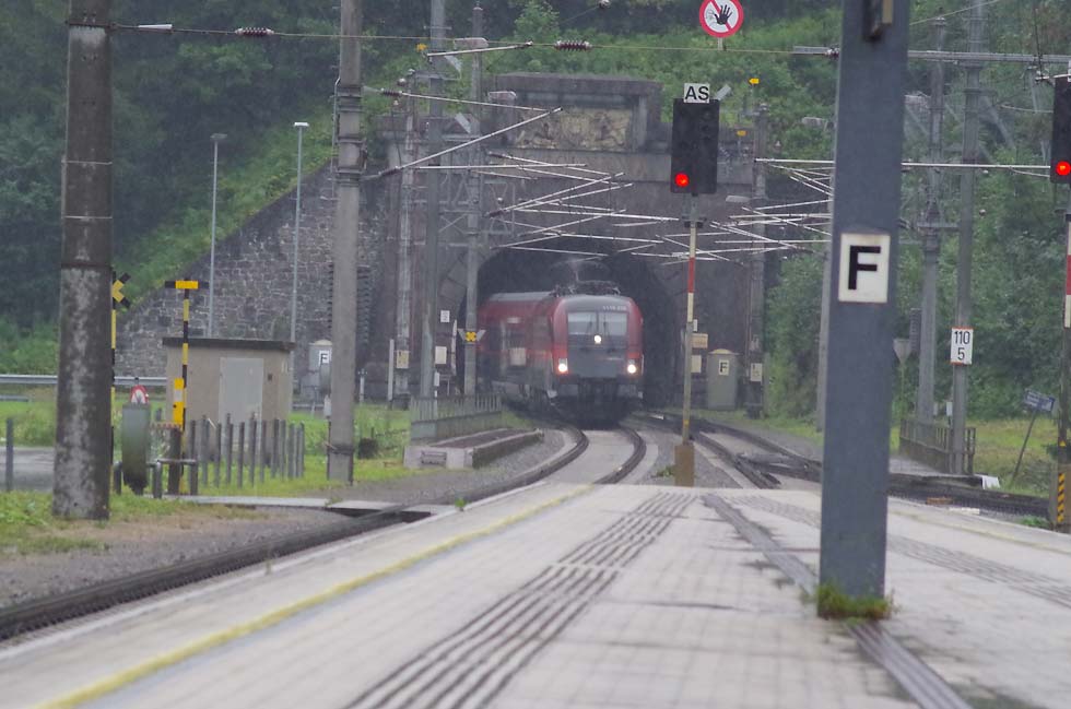 Der Arlberg ist zuweilen arg „Taurus-Lastig“. Was tun um das auszugleichen ? Den Taurus in der Landschaft stellen.... (oder in die...). Außerdem ist im Güterverkehr ja noch die gute alte (ja, sie werden langsam alt) 1044 / 1144 präsent. Und die eine oder andere Überraschung gibt es ja auch beizeiten. So also nachfolgend Schnappschüsse, Porträts und Totalen aus 14 Tagen hier und da, oder von ganzen Tagen, die Ost- und Westrampe der Arlbergbahn rauf und runter. ![]() ...das fängt ja gut an. Am ersten Tag in Landeck nicht schnell genug aus dem Auto, nur im Nachschuss 1142 613 mit Vorspann 1142 562 der StB bei Ausfahrt mit Container-Ganzzug Richtung St. Anton ![]() 1116 201 dafür in voller Pracht wenig später auch unterwegs in Richtung Ostrampe ![]() Anderes Ende in der Zugförderungsstelle Bludenz: 1063 050 hat Sonntagsruhe neben einem der beeindruckenden Schneepflüge der ÖBB ![]() 1144 028 zwei Gleise weiter auf Tuchfühlung mit dem Prellbock ![]() 1144 125 mit Vorspann 1144 046 und einem gemischten Güterzug wartet im Güterbahnhof auf die Weiterfahrt zur Westrampe ![]() ET 10.122 wartet am Bahnsteig auf neue Aufgaben... ![]() ..ebenso ET 10.121. Eigentümlicherweise habe ich im Montafon die 14 Tage nur ÖBB Talents fahren sehen ![]() 1116 193 mit einer Wiesel-Garnitur abgestellt auf der Ostseite ![]() Der Retrofit-Talent 4024 130 macht sich auf den Weg nach Lindau... ![]() ...4024 136 wird ihn auf dem Abschnitt A in Gleis 1 sodann beerben/vorrücken ![]() Das erste Mal nach Hintergasse, ein reiner Betriebsbahnhof an der Westrampe. Erstmal leider nur mit einem bergwärts fahrenden Railjet, 1116 221 schiebt... ![]() ...in den Tunnel. Man beachte die Außermittig verlegten Gleise ![]() Die in Bludenz schon fotografierten 1144er folgen unmittelbar danach. ![]() In Gegenrichtung der nächste Railjet macht sich mit seinen Fernlichtern im Tunnel rechtzeitig bemerkbar... ![]() ...1116 210 setzt sich wenige Augenblicke später gut in Szene ![]() Da das Wetter immer schlechter wird nach Langen, unters Bahnsteigdach, 11160 226 verläßt mit dem nächsten RJ eine Stunde später den Arlbergtunnel... ![]() ...und zieht sehr fotogen den Regen im Luftstrom des Dachstromabnehmers hinter sich her. ![]() Nächstes Meeting Ostrampe, hinter Pians eine 1116 mit der Dorkirche von Tobadill. Und-Glück gehabt, es zieht eine rote.... ![]() ...und es schiebt die eigentliche. Das war wohl der Steuerwagen kaputt... ![]() Neuer Fotopunkt: Klausbach Aquädukt, zwischen Strengen und Flirsch. Die Ostwärts schiebende 1116 230 offenbart das Potential... ![]() ...das 1116 122 Vorspann und Zuglok ? mit dem einzigen noch verkehrenden EC nach Zürich auf den nächsten drei Bildern voll ausschöpft. ![]() ![]() ![]() Nein, keine Modellbahn, Bhf. Strengen aus der Perspektive der anderen Talseite mit einem Doppel-RJ.... ![]() ...und 1116 218 als Porträt im Nachschuss. ![]() Zufallstreffer einer Werbelok vor einem RJ bei Pians ![]() Eine alte Stelle oberhalb der Zufahrt ins Paznaun hinter Pians, wiederum der EC mit 1116 1116. Die Stelle ist auch für eine Bildserie gut und einen Nachschuss auf die Trisannabrücke ![]() ![]() ![]() ![]() Und dann kommt, beim Abbauen, der offensichtlich verspätete Container-Ganzzug der StB vorbei.... ![]() ...und 1142 562 legt sich schön in die Kurve. Letztes Jahr zogen diesen Zug noch zwei ÖBB Tauri ![]() Die Trisannabrücke und ein RJ darauf darf nicht fehlen, hier mit Schloss Wiesberg.... ![]() ...und nochmal mit Tele. ![]() Und auch wieder eine Bewuchsfreie Stelle gefunden, um z.B. den Gegen-EC nach Wien im Morgenlicht zu knipsen.... ![]() und einen RJ in Gegenrichtung ![]() Bahntechnik im 21. Jahrhundert. ![]() Kein Wunder dass ein Railjet hier nicht schnell ist- zwischen Stregen und Flirsch... ![]() …und die Geräuschkulisse beim vorbeiziehen ist entsprechend! ![]() Szenenwechsel: nochmal Bhf. Hintergasse Richtung Bludenz: 1116 248 klebt am Berg und fährt gerade.... ![]() ...auf die Schanatobelbrücke ![]() So sieht das dann aus dem Tal aus. ![]() Und zum Schluss noch ein Zufallstreffer des 'Fehlfarben RJ' (der Steuerwagen ist gut eine Woche später wohl immer noch defekt...) im Berg bei Pians.... ![]() ...und das klassische Motiv: RJ auf der Trisannabrücke vom Talgrund. Text und Bilder: Holger Fuhr |