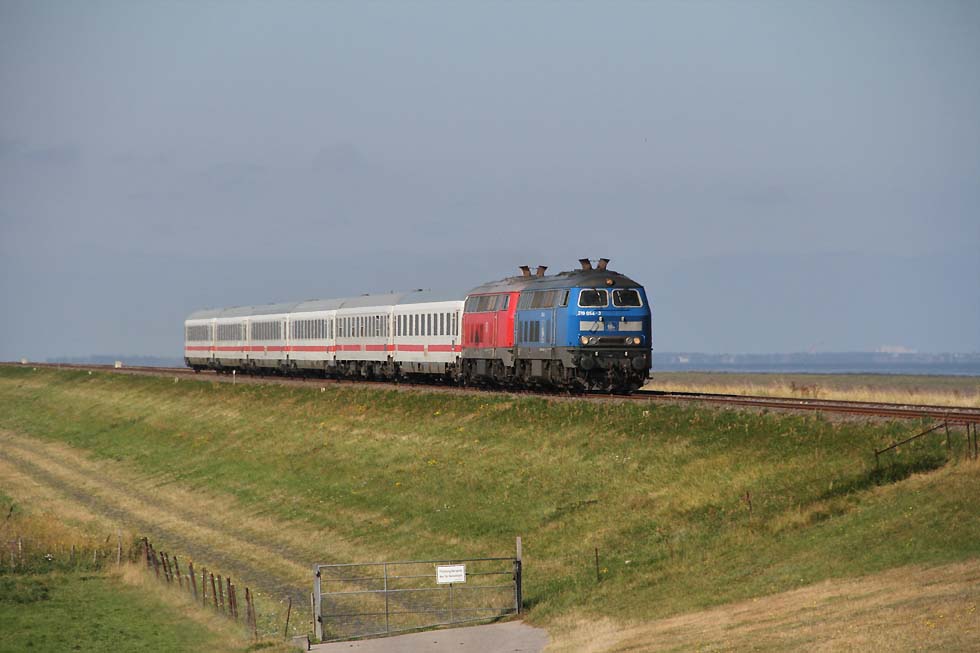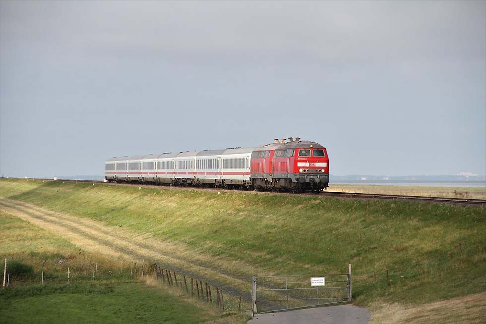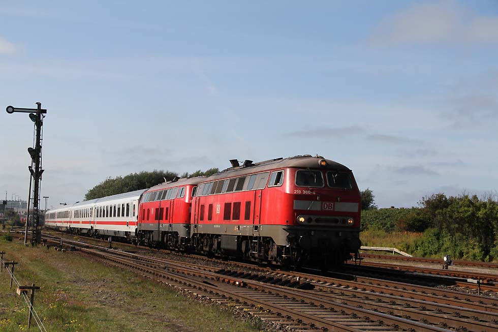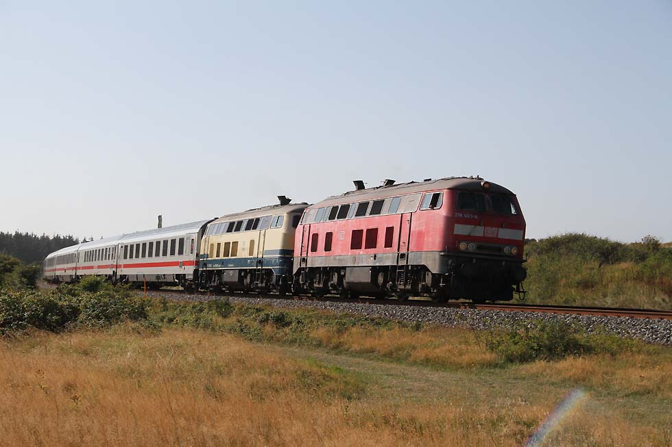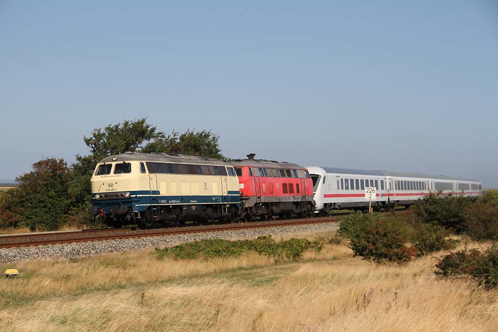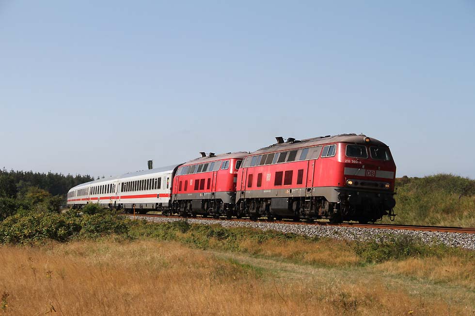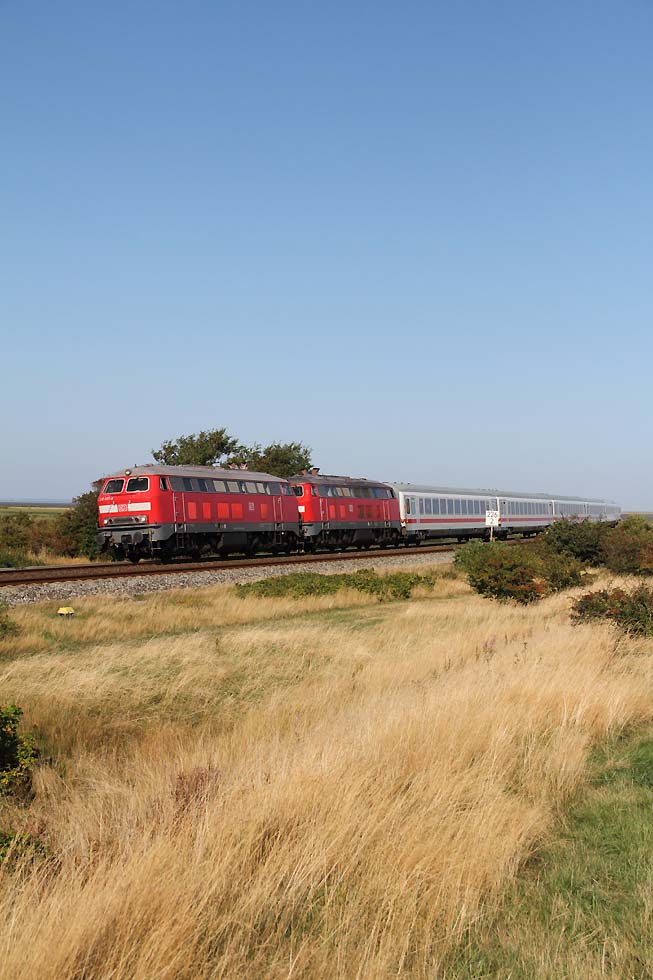 ![]() 218 463+218 490 mit IC 2073 Westerland-Dresden von Westerland kommend in Richtung Damm, 01.09.2021.