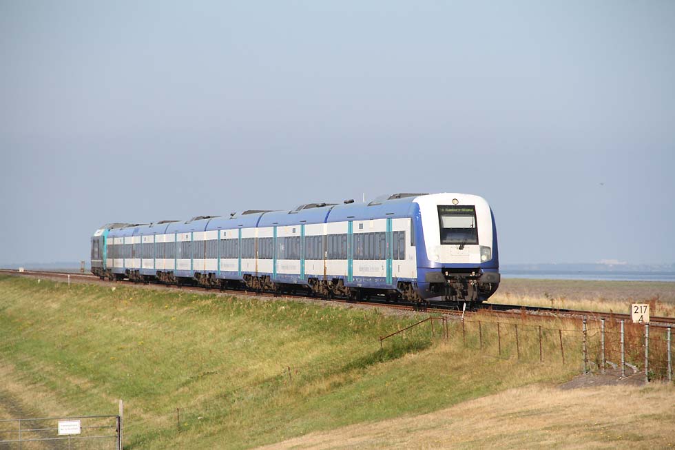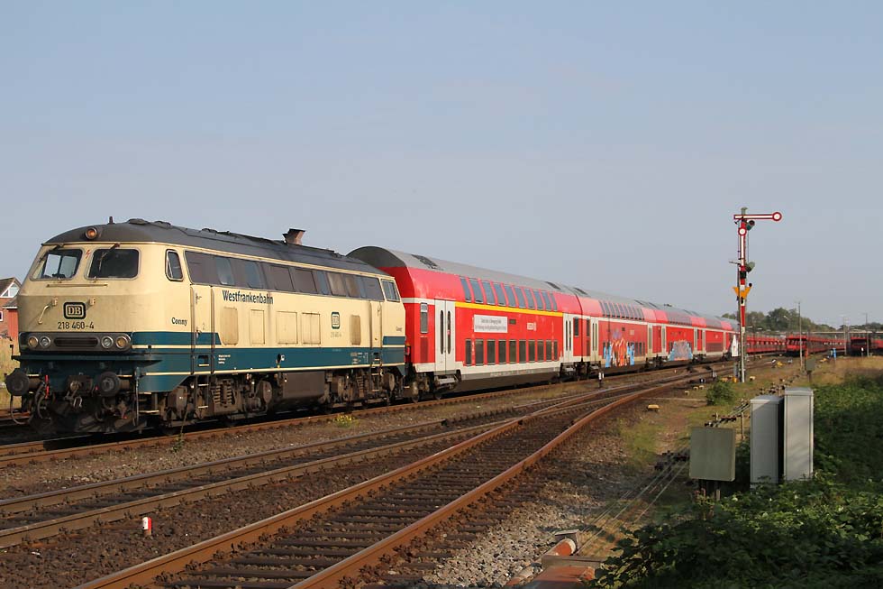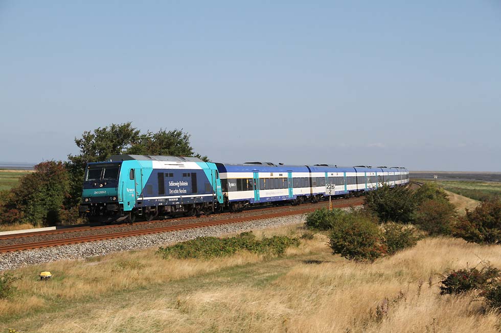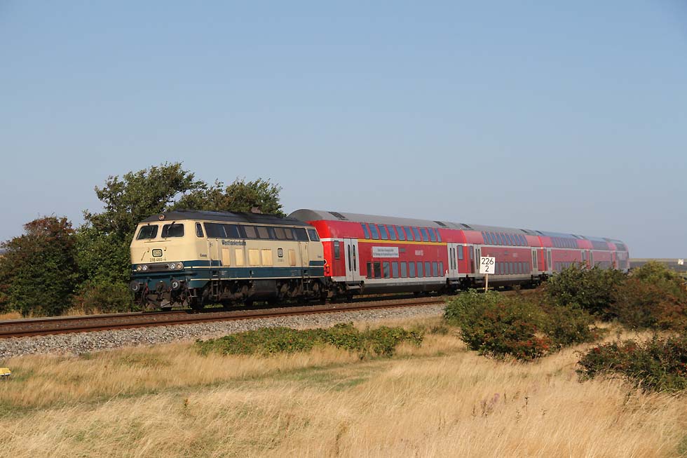 ![]() 218 460 'Conny' mit RE6 von Hamburg Altona nach Westerland vom Damm kommend mit nächster Halt Morsum, 01.09.2021.