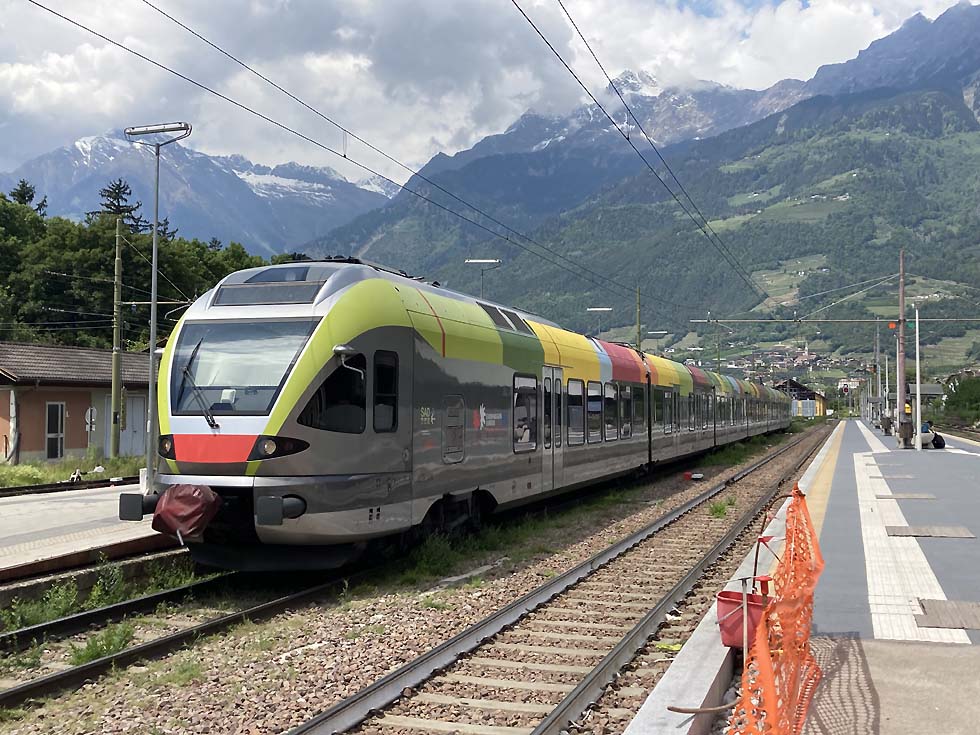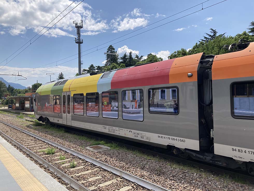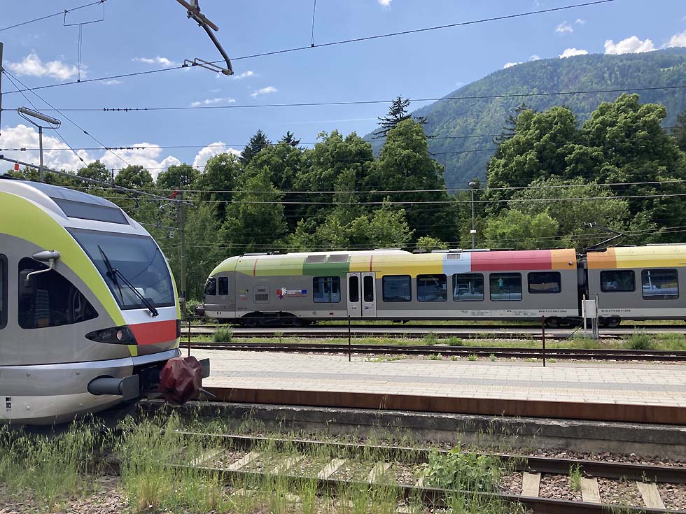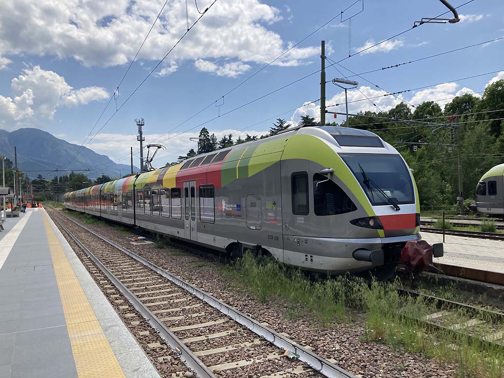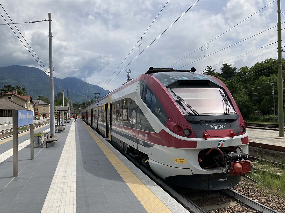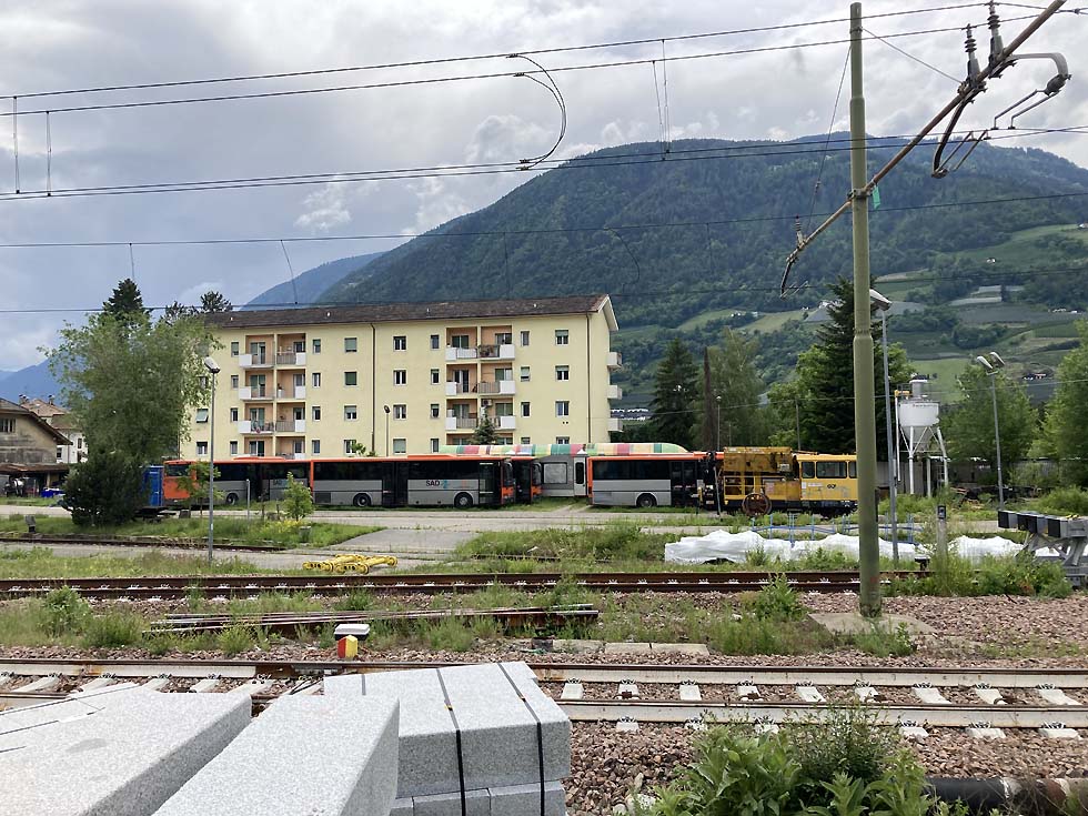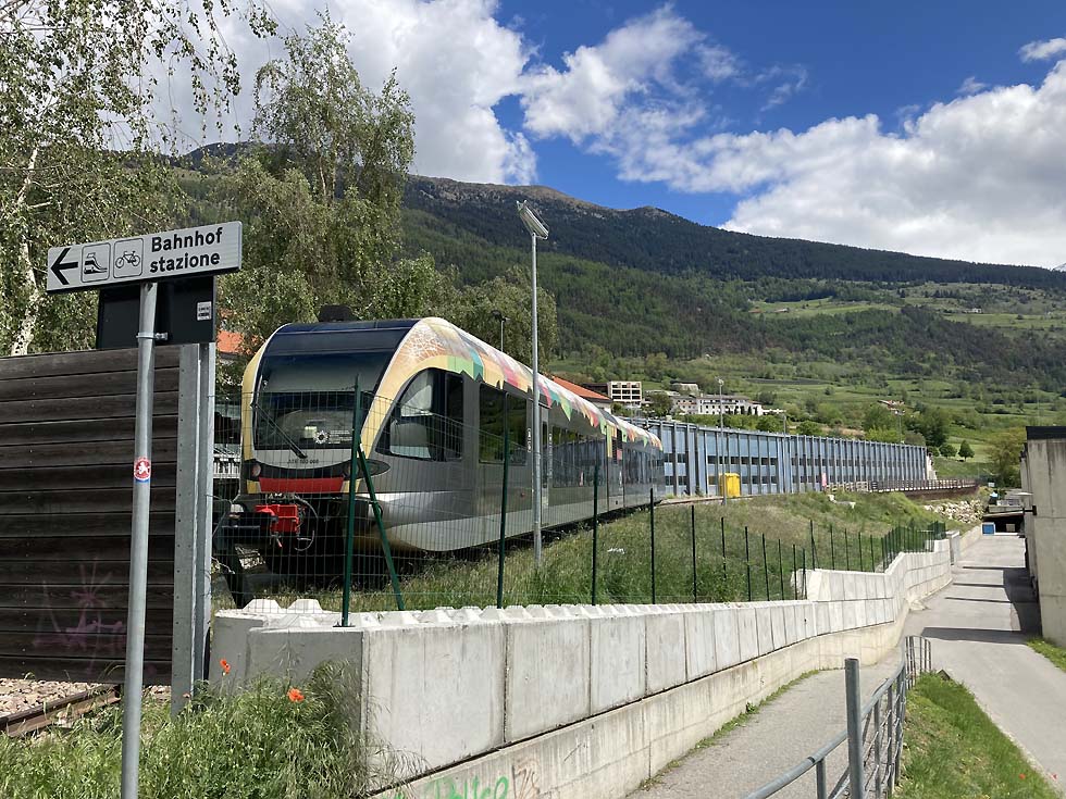 Ich war mit meiner Frau Mitte/Ende Mai 23 eine Woche in Meran im Urlaub. Der Hinweg führte uns über den Reschenpass und das Vinschgau nach Meran. Zurück ging es über den Brenner. Natürlich sind auch wieder Fotos zum Hobby entstanden. In Meran enstanden am 19. Mai 2023 die Aufnahmen des ETR 526 014 ![]() In Meran entstanden am 19. Mai 2023 die Aufnahmen des ETR 526 014 ![]() ETR 526 014 am 19. Mai 2023 in Meran ![]() ETR 526 014 am 19. Mai 2023 in Meran ![]() ETR 526 014 am 19. Mai 2023 in Meran ![]() ATR 100 008 ist am Do 18.05.2023 in Mals auf dem Gleis abgestellt, das, wenn man den Prellbock und die Bretterwand abbauen würde, prinzipiell zum Wendestern führt. ![]() ATR 100 010 steht am Do 18.05.2023 um 12.42 auf Gleis 1 im Bahnhof Mals und hält dort Mittagspause. Die Zugzielanzeige zeigt Außer Dienst. Von den ursprünglich 12 gelieferten Stadler GTW sind noch 11 in Betrieb. ATR 100 008 ging im April 2012 bei einem durch eine Mure verursachter Unfall verloren. Aktuell wird ein Inselbetrieb Mals – Töll gefahren. Zwischen Töll und Meran verkehren stattdessen derzeit Ersatzbusse.
