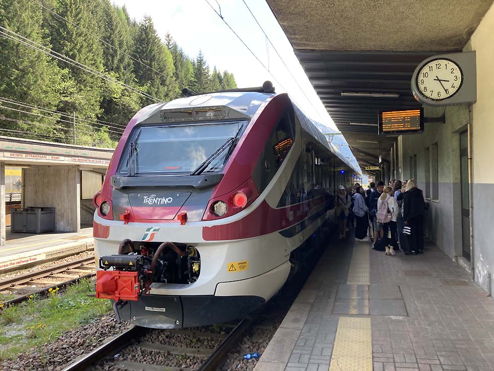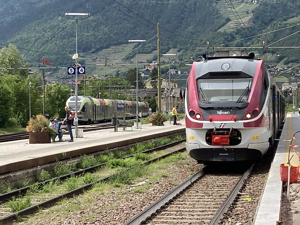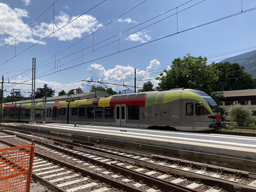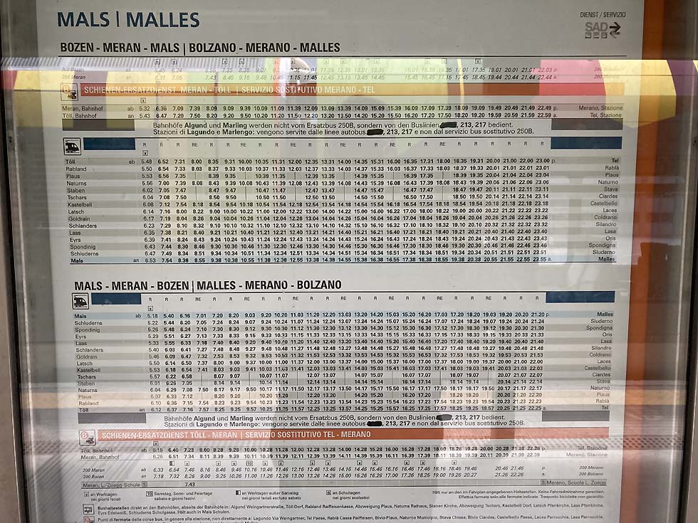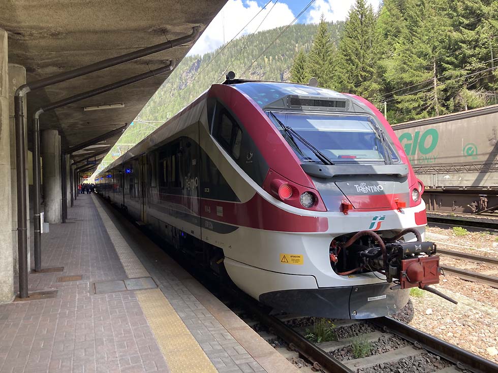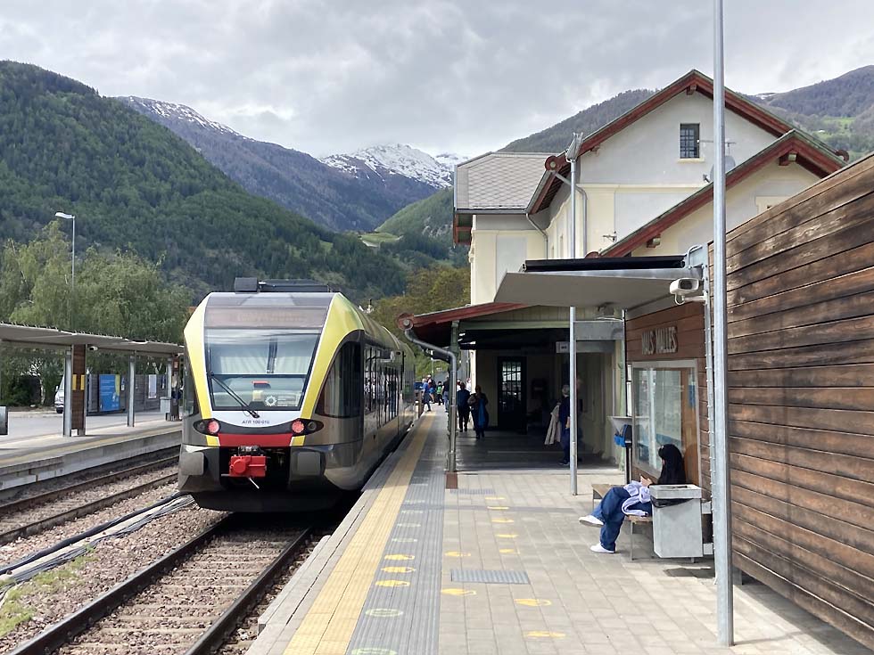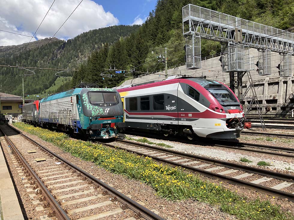 Ich war mit meiner Frau Mitte/Ende Mai 23 eine Woche in Meran im Urlaub. Der Hinweg führte uns über den Reschenpass und das Vinschgau nach Meran. Zurück ging es über den Brenner. Natürlich sind auch wieder Fotos zum Hobby entstanden. In Meran enstanden am 19. Mai 2023 die Aufnahmen des ETR 526 014 ![]() In Meran entstanden am 19. Mai 2023 die Aufnahmen des ETR 526 014 ![]() ETR 526 014 am 19. Mai 2023 in Meran ![]() ETR 526 014 am 19. Mai 2023 in Meran ![]() ETR 526 014 am 19. Mai 2023 in Meran ![]() ATR 100 008 ist am Do 18.05.2023 in Mals auf dem Gleis abgestellt, das, wenn man den Prellbock und die Bretterwand abbauen würde, prinzipiell zum Wendestern führt. ![]() ATR 100 010 steht am Do 18.05.2023 um 12.42 auf Gleis 1 im Bahnhof Mals und hält dort Mittagspause. Die Zugzielanzeige zeigt Außer Dienst. Von den ursprünglich 12 gelieferten Stadler GTW sind noch 11 in Betrieb. ATR 100 008 ging im April 2012 bei einem durch eine Mure verursachter Unfall verloren. Aktuell wird ein Inselbetrieb Mals – Töll gefahren. Zwischen Töll und Meran verkehren stattdessen derzeit Ersatzbusse.