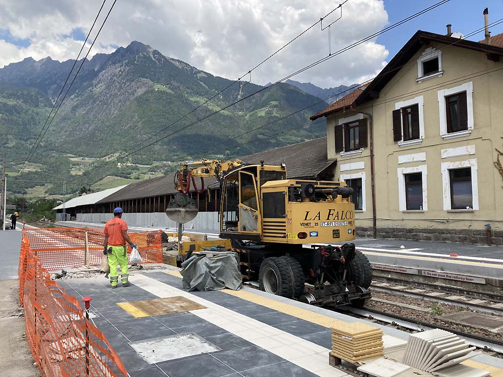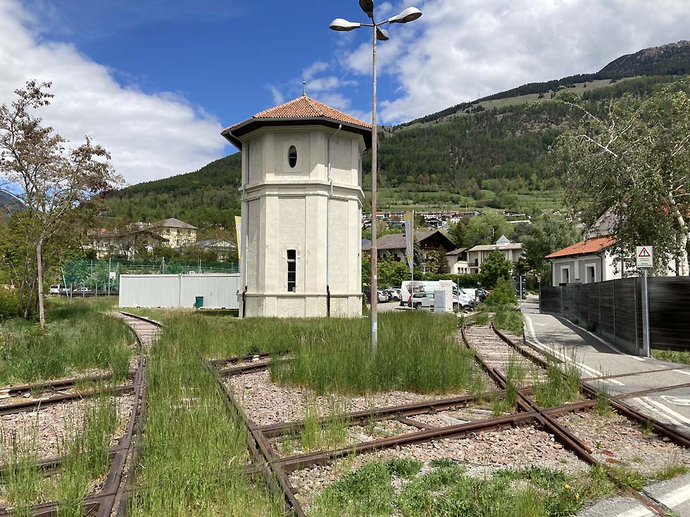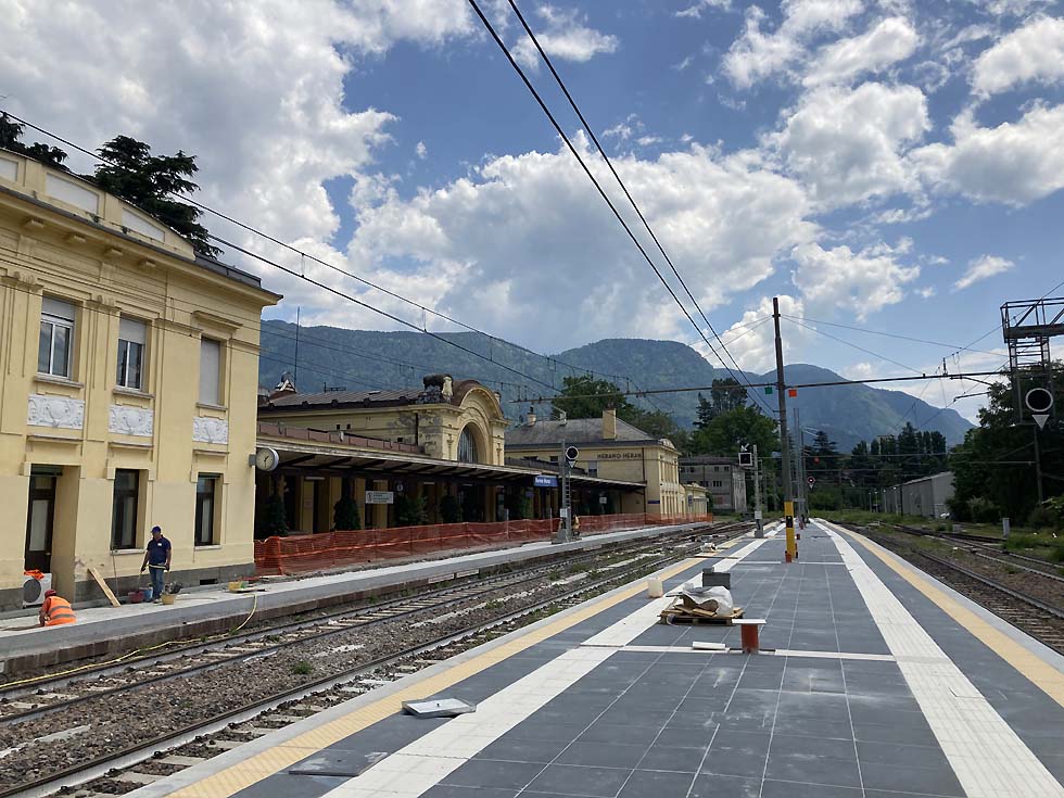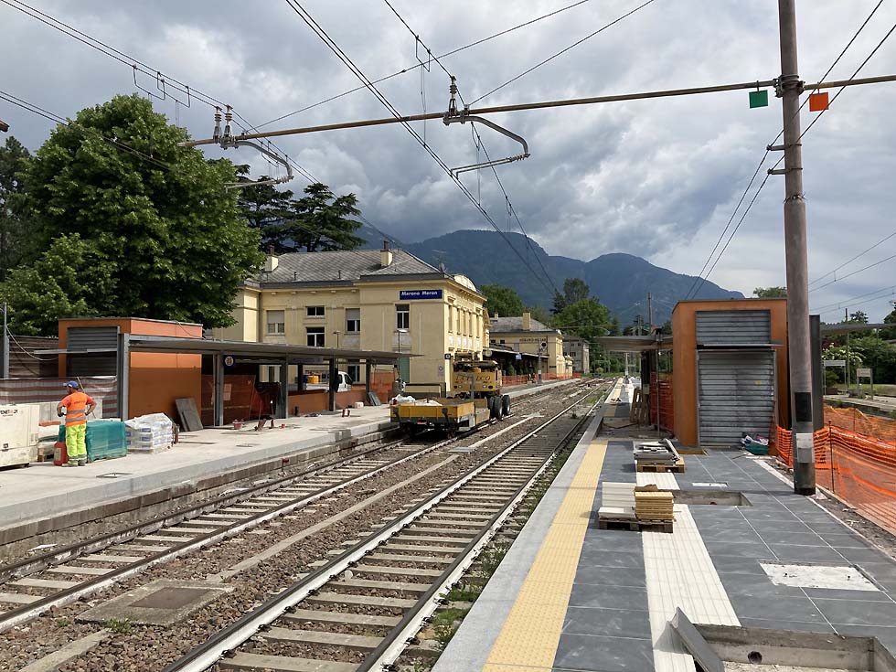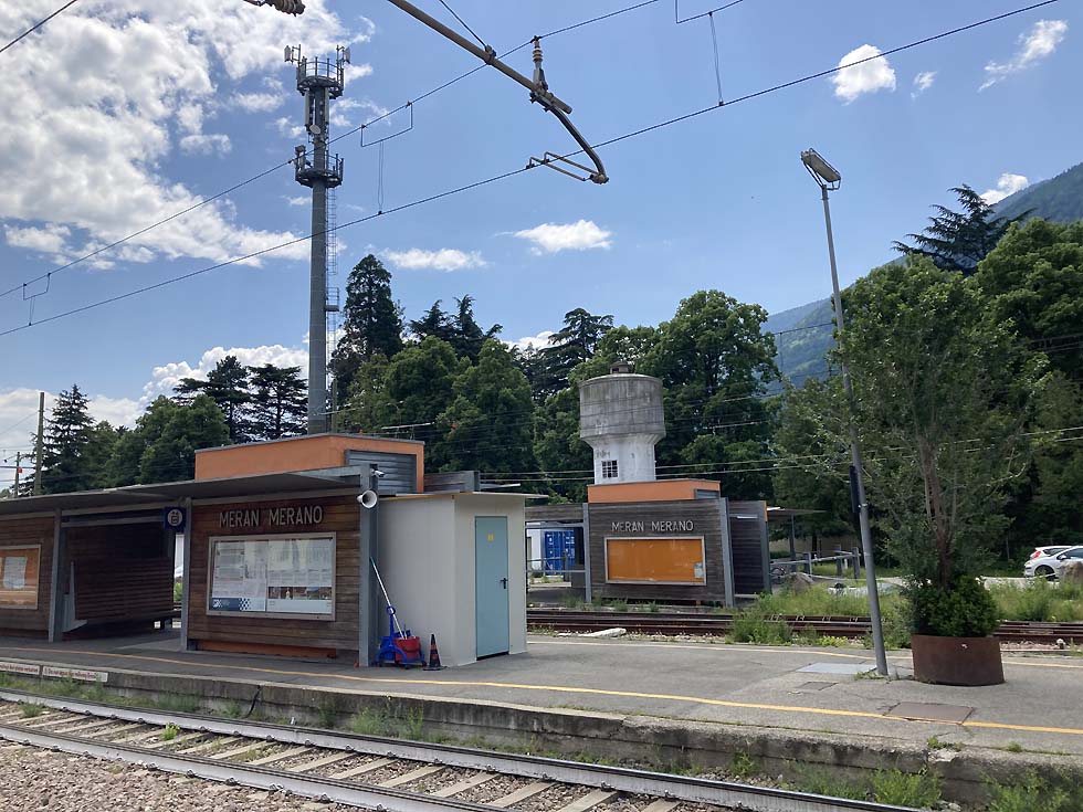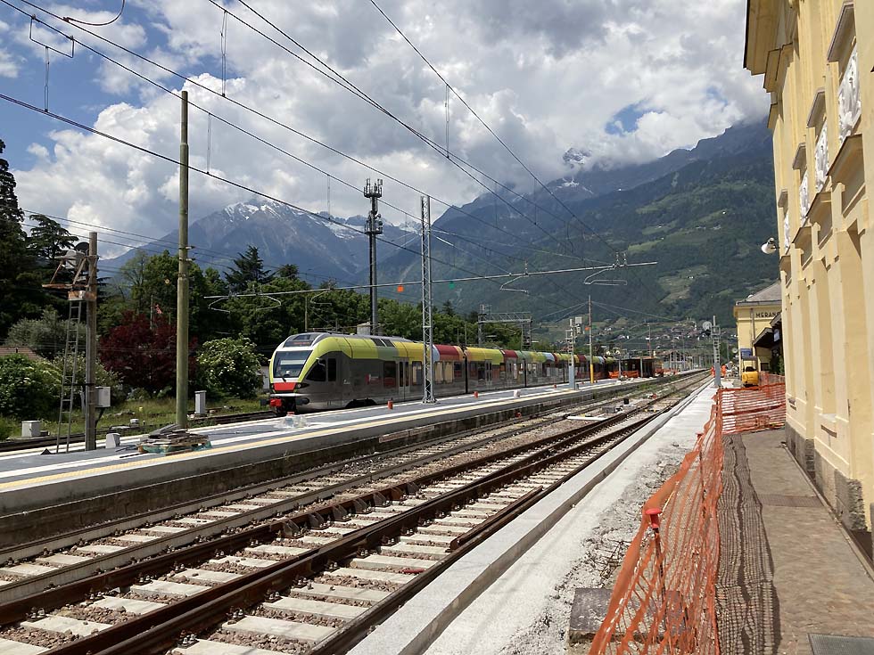 ![]() Wendestern Mals Bahnhof, Gleisanlagen und Turm am Wendestern am 19. Mai 2023. ![]() ETR 170 im Bahnhof Meran Merano (Trentino - Südtirol), 19. Mai 2023, im Hintergrund ein zerfallender Lokschuppen ![]() ETR 170 im Bahnhof Meran Merano (Trentino - Südtirol), 19. Mai 2023, im Hintergrund ein zerfallender Lokschuppen ![]() Der Bahnhof Meran Merano (Trentino - Südtirol) wird umgebaut, 19. Mai 2023. Das Bahnsteig-Niveau wird angehoben.