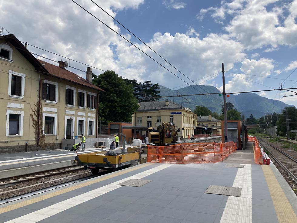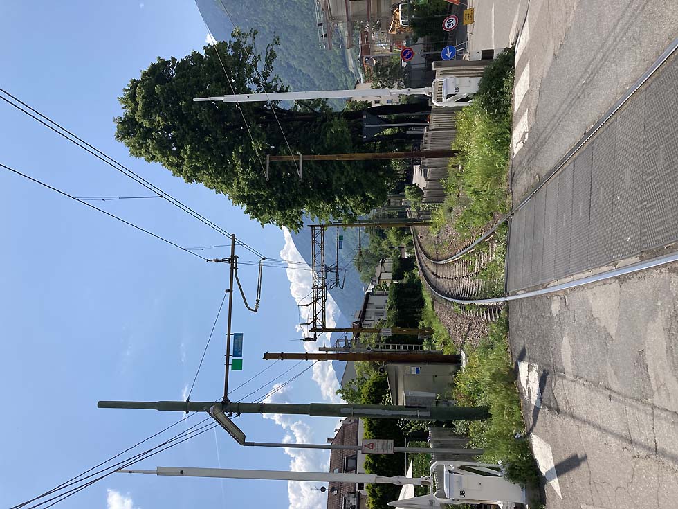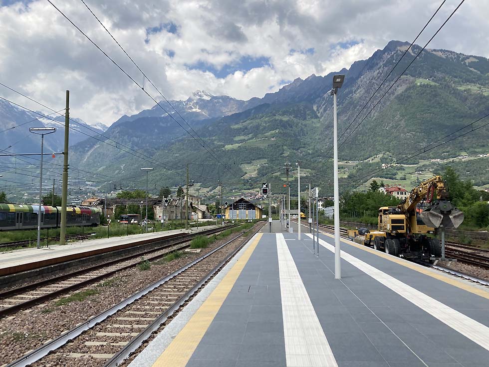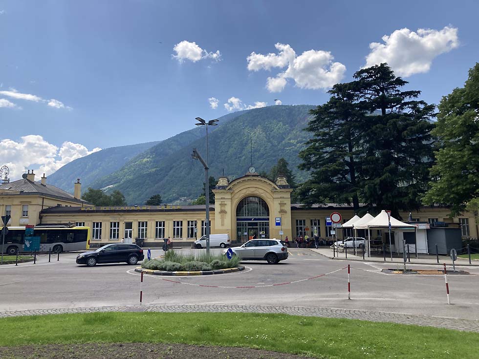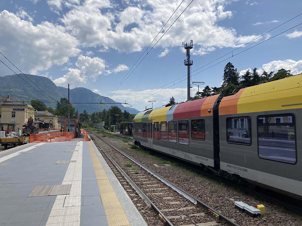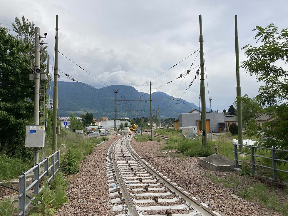 ![]() Wendestern Mals Bahnhof, Gleisanlagen und Turm am Wendestern am 19. Mai 2023. ![]() ETR 170 im Bahnhof Meran Merano (Trentino - Südtirol), 19. Mai 2023, im Hintergrund ein zerfallender Lokschuppen ![]() ETR 170 im Bahnhof Meran Merano (Trentino - Südtirol), 19. Mai 2023, im Hintergrund ein zerfallender Lokschuppen ![]() Der Bahnhof Meran Merano (Trentino - Südtirol) wird umgebaut, 19. Mai 2023. Das Bahnsteig-Niveau wird angehoben.