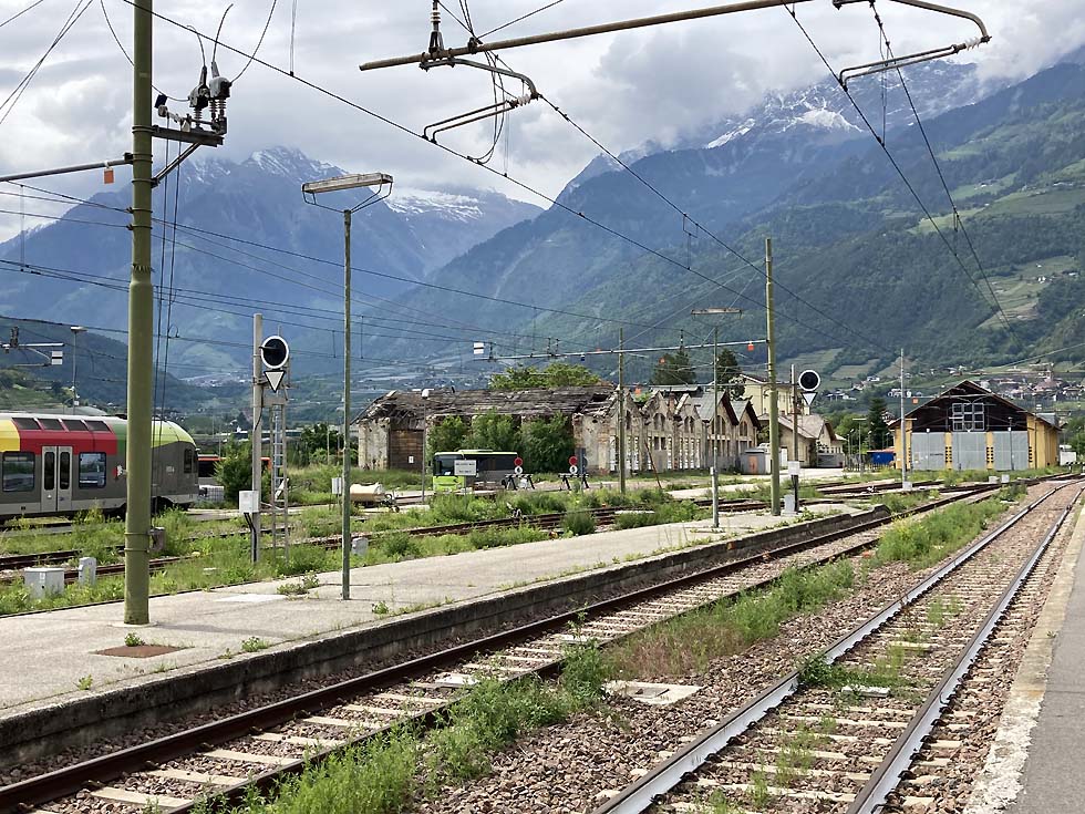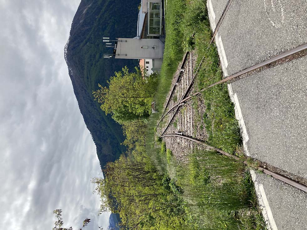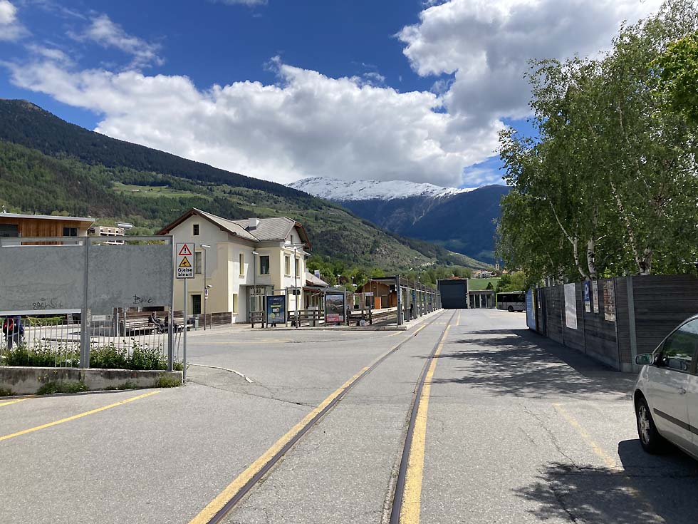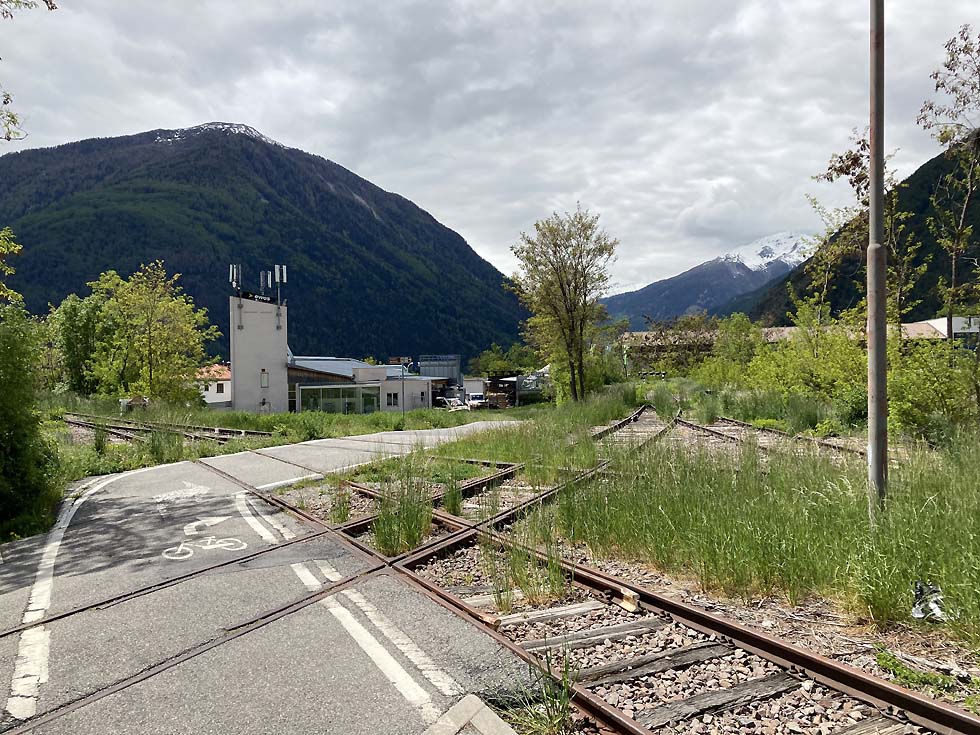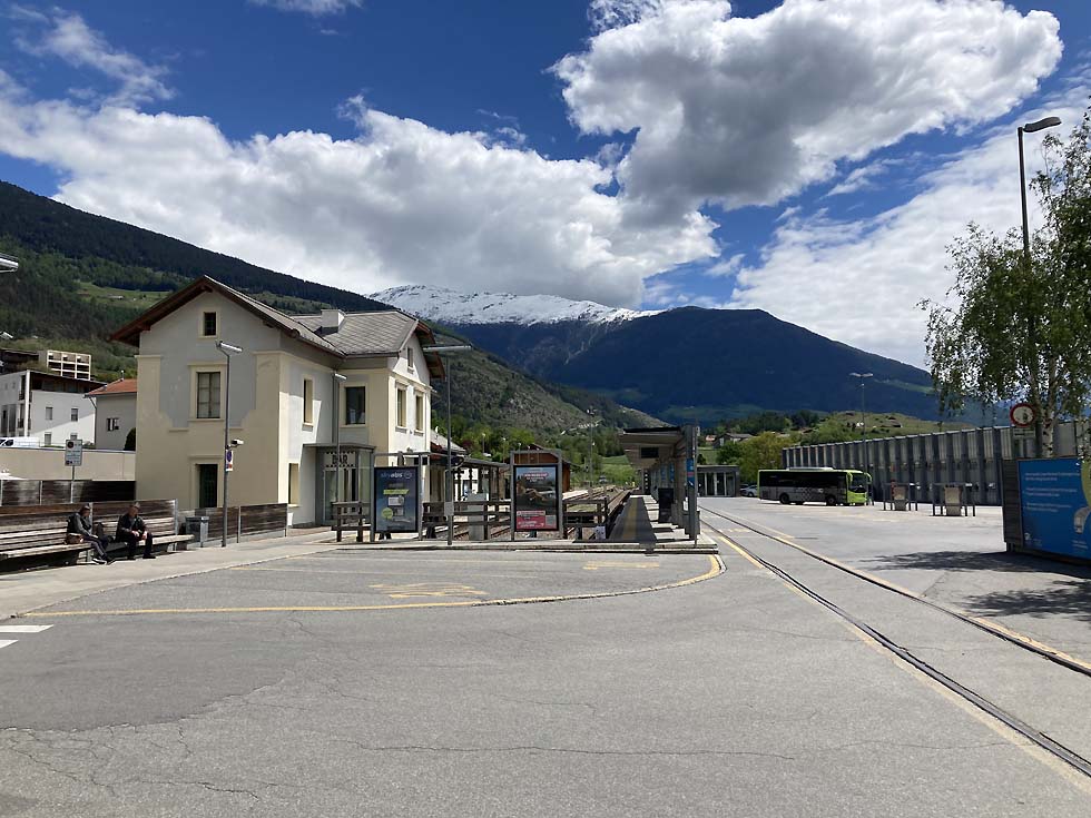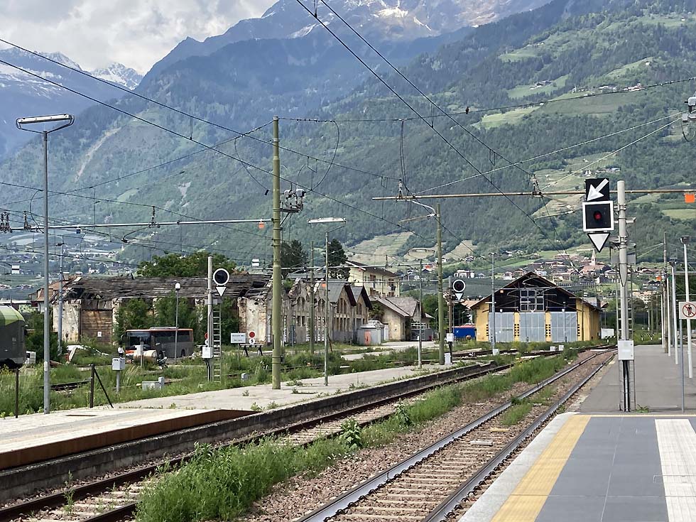 ![]() Mals – Vinschgaubahn, Blickrichtung Südosten, Bahnhof Meran Merano am 19. Mai 2023. ![]() Mals – Busabstellanlage hinter dem zerfallenden Lokschuppen. Im Hintergrund ist der Rest des 2010 verunglückten ATR 170 008 zu erkennen. am 19. Mai 2023.