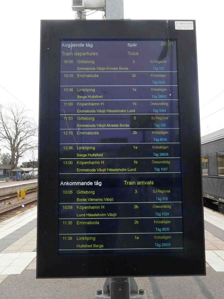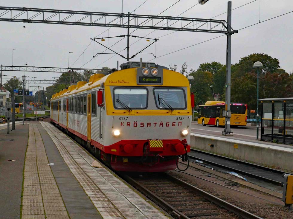 ![]() Straßenbahn 468 auf dem Weg zum Hauptbahnhof in Stockholm. Dieser ist für Eisenbahnfotografen mehr oder weniger uninteressant, da sich leider alles unterirdisch abspielt. ![]() 4358 der Bahngesellschaft ORESUNDSTAG im Bahnhof Kalmar. ![]() 1382 „NILS Dacke“ abfahrbereit im Bahnhof Kalmar. ![]() 9174 106 1367-8 Rc6 der SJ fährt mit einem Personenzug im Bahnhof Kalmar ein. ![]() 9174 106 1367-8 Rc6 der SJ hat sich an das andere Zugende gesetzt und ist bereit für die Rückfahrt, Bahnhof Kalmar.. ![]() 4381 der Bahngesellschaft ORESUNDSTAG im Bahnhof Kalmar. ![]() Das Bahnhofsgebäude in Kalmar. ![]() 9174 106 1344-7 Rc6 der SJ hat mit ihrem Zug in Kalmar übernachtet und steht noch auf dem Abstellgleis Bahnhof Kalmar ein. ![]() 9174 106 1344-7 Rc6 der SJ wurde auf ein Bahnsteiggleis umrangiert und wartet im Bahnhof Kalmar auf Passagiere. ![]() 3137 der Bahngesellschaft KRÖSATAGEN fährt in den Bahnhof Kalmar ein. ![]() 4581 der Bahngesellschaft ORESUNDSTAG und 3137 der Bahngesellschaft KRÖSATAGEN im Bahnhof Kalmar. ![]() Das Überschreiten der Gleise wird im Bahnhof Kalmar mit einer Schranke gesichert.