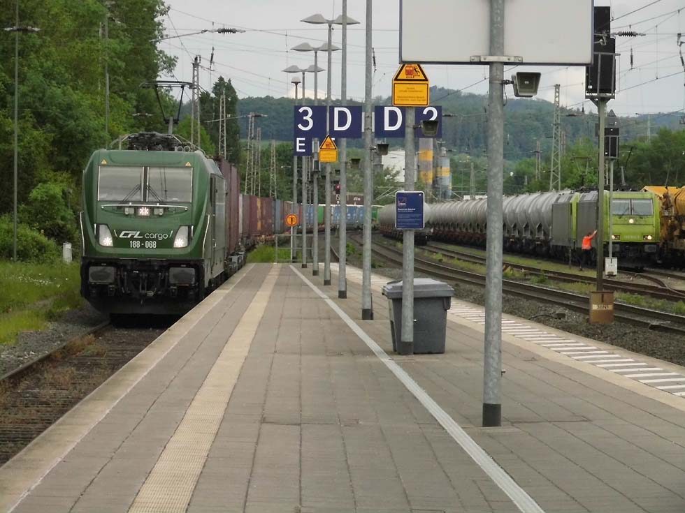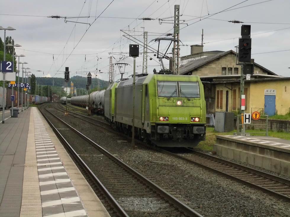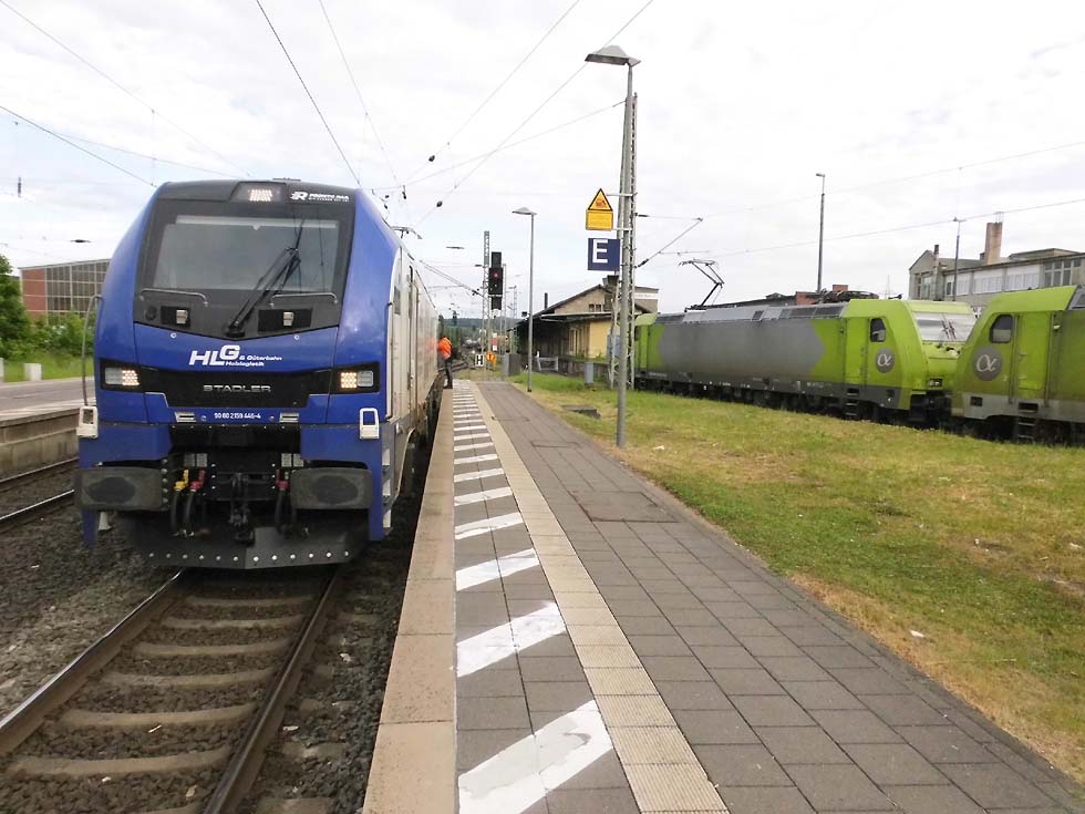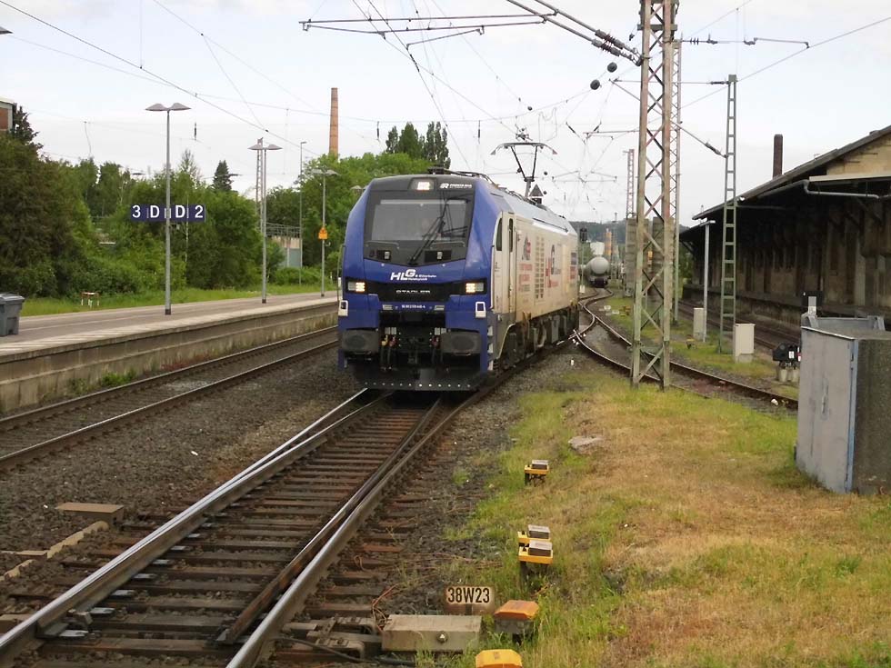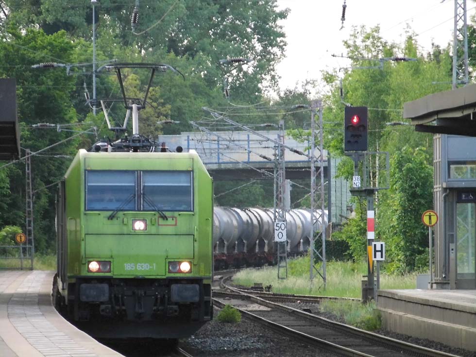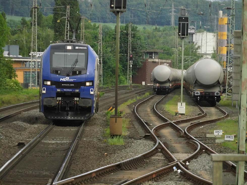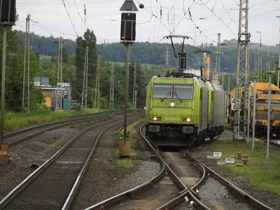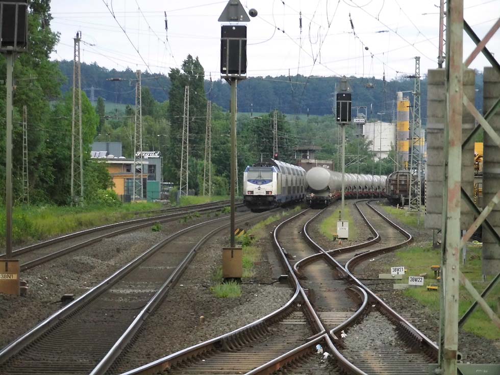 ![]() Zunächst fährt 187 152 mit allerhand Gütern in Richtung Göttingen. ![]() Nun kommt der Zug, der zur Seite muss: die Alpha-Tierchen 185 630 und 185 603 mit einem vollen Kalilaugenzug. ![]() Langsam geht die Fahrt nach Gleis 11. ![]() Nun könnte die Geschichte vorbei sein – 146 537 überholt mit dem RE2 nach Hannover nach dem halt in Alfeld den Laugenzug. ![]() Aber dann kommt 2159 215 mit dem nächsten Kalilaugenzug ums Eck und passiert den Kollegen im Ausweichgleis mit Pfiff zum Gruße. ![]() Und dann rollen 185 630 und 185 603 ins Stumpfgleis an der alten Laderampe, nachdem sie den Zug abgehängt haben... ![]() Sieht aus wie ein etwas ungepflegter Garten mit exklusiver Gartenlaube... ![]() Sieht aus wie ein etwas ungepflegter Garten mit exklusiver Gartenlaube... ![]() Um die Spannung noch zu erhöhen, ist inzwischen 2159 446 mit einem Laugenleerzug aus Norden in Gleis 12 eingelaufen. Langsam schwant mir, was hier passiert. ![]() 146 521 mit RE2 nach Göttingen passiert die Laugenzüge. ![]() 2159 446 hat abgehängt und zieht ins Hauptgleis vor, um die Züge zu umfahren – man will die Loks wechseln! ![]() Die Rangiererlaubnis ist erteilt, letzte Worte werden gewechselt, dann wird 2159 446 den vollen Zug bespannen und die 185er übernehmen den Leerzug. ![]() 2159 446 auf dem Weg ans andere Ende. ![]() 185 603 und 185 630 machen sich auf an ihren neuen Zug. ![]() Das sieht ein wenig nach Riesenslalom aus... ![]() Anhängen, Bremsprobe und warten auf den Abfahrauftrag. ![]() 193 521 mit ihrem KLV-Zug fährt südwärts am Geschehen vorbei. ![]() 146 517 mit RE2 muss erst noch passieren, bevor 185 603 und 185 630 zurück ins Kalirevier fhren können. ![]() Dann rollt auch noch die neue 188 068 von CFL Cargo mit einem Containerzug in Gleis 3 ein... ![]() …und für 185 603 und 185 630 geht es endlich weiter, in der Bahnhofsausfahrt werden sie auch auf die richtige Seite wechseln. ![]() 2159 216 mit dem nächsten Laugenleerzug muss deshalb erstmal warten.... Text und Bilder: Thomas Förster |