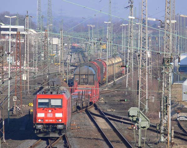 Aufgrund der noch andauernden Sperrung der Gz-Strecke Köln-Düsseldorf (bis/ab Opladen) müssen die Güterzüge in Opladen auf die Strecke über Schlebusch wechseln. So auch 185 398, als diese am 22.02.2011 eine Kreuzung im Bf Opladen abgewartet hat und Opladen Richtung Schlebusch verläßt.