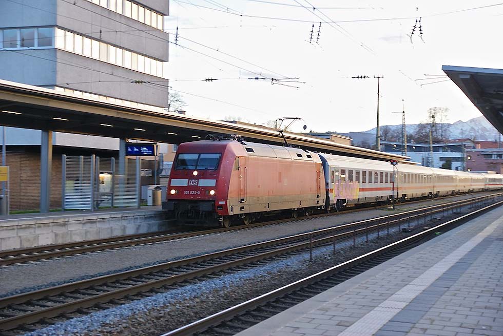 101 023 mit dem EC 115 in Traunstein, 25.11.2022.