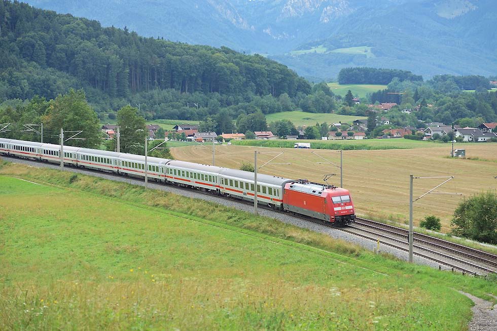 101 091 mit IC 1290 am falschen Gleis Richtung München unterwegs, hier durch Vachendorf, 16.08.2023.