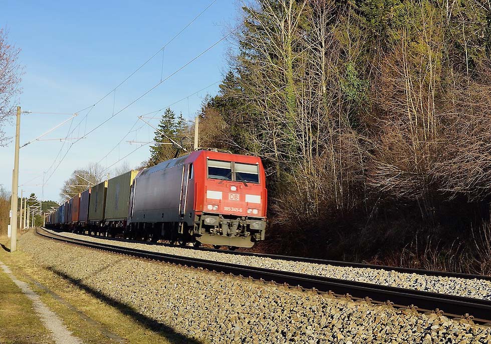185 345 mit Containerzug durch Vachendorf, 30.12.2023.