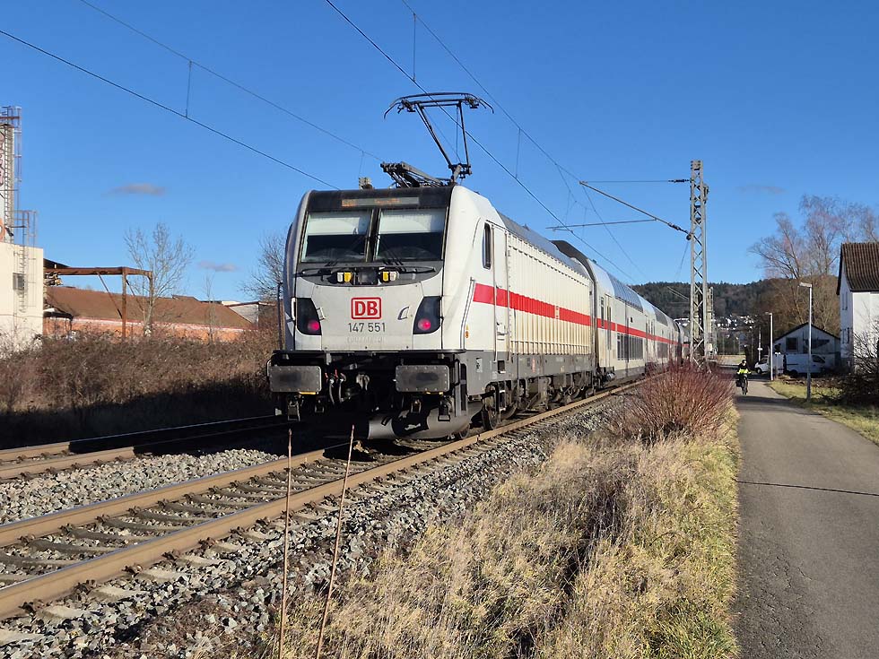 DB 147 551, die 147.5 mit der niedrigsten Ordnungsnummer, hat am Sonntag, den 26.01.2025 die Aufgabe IC 2161 von Karlsruhe nach Leipzig zu bringen. Dabei wird in Stuttgart Hbf und Nürnberg Hbf jeweils die Fahrtrichtung gewechselt. Von Stuttgart nach Nürnberg wurde der Zug geschoben, als um 14.30 Uhr der Remsbahn-Haltepunkt Urbach durcheilt wird. Der nächste planmäßige Halt Schwäbisch Gmünd wird um 14.41 Uhr erreicht. Nürnberg Hbf um 16.16 Uhr und das Fahrtziel Leipzig Hbf um 20.09 Uhr.