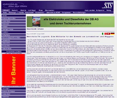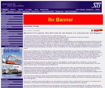Bei den zahlreichen Unterseiten gibt es einige stark abgerufene Seiten. Diese bieten ebenfalls eine sehr große Aufmerksamkeit und werden deshalb in der Preiskategorie 2 zusammengefasst. Im einzelnen handelt es sich um die Übersichtsseiten der Bereiche Aktuell und Statistik, die Nachrichtenstartseite, die Startseite der Sichtungen und der E-Stories sowie die Bestandsliste der DB Elektroloks. Hier kann wahlweise mit dem Bannertyp b) oder c) oder natürlich beiden Bannertypen gemeinsam geworben werden: